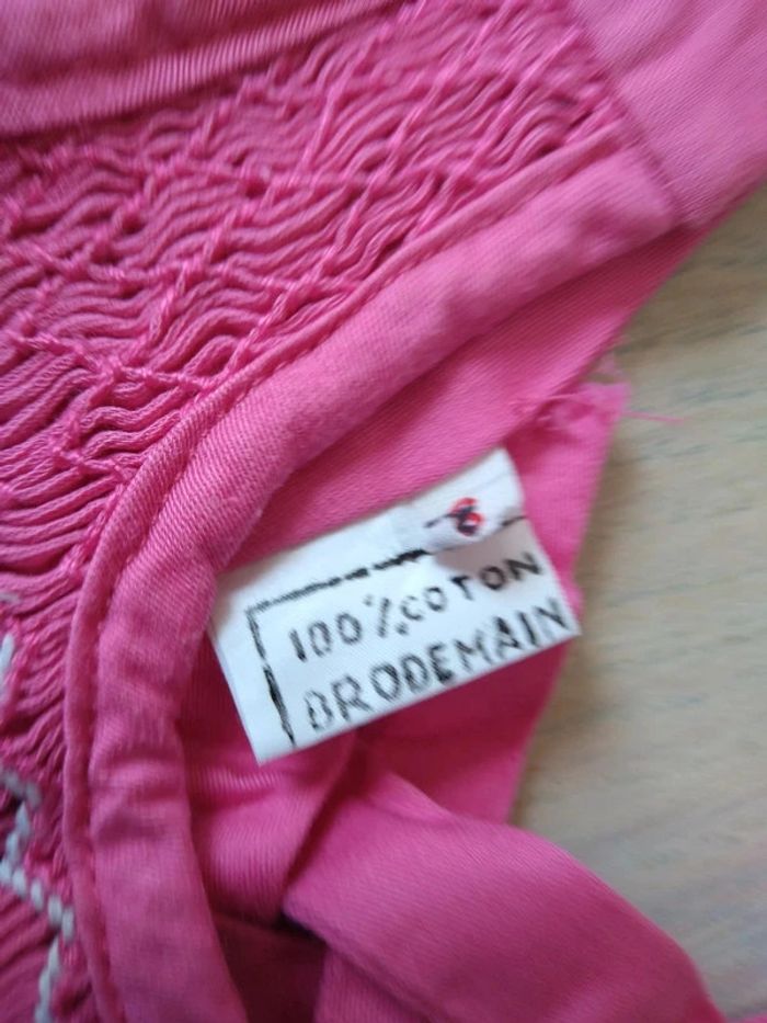 Robe rose vif sans manches avec broderies petites fleurs. Brodée main. Ceinture à nouer derrière. Coton Taille 6 mois #marine4932fille6mois Réductions activées !