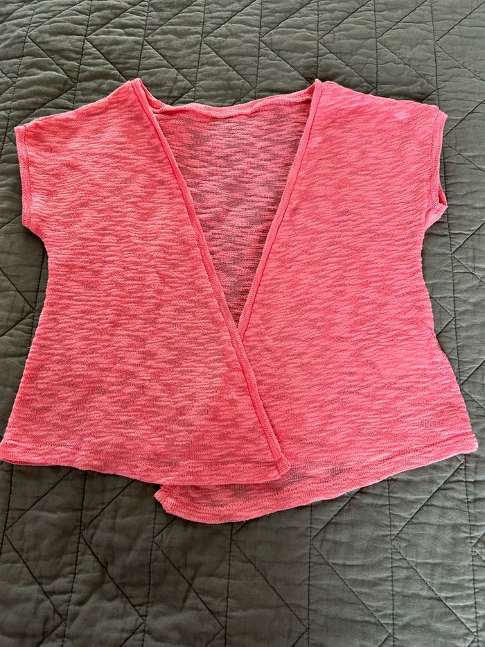Petit gilet léger sans manches de la marque « C&A ». Taille 134/140 (9/10 ans). Couleur rose saumon, devant asymétrique sans boutonnage. Idéal pour les soirées d’été, sur une robe à bretelles ou un t-shirt à bretelles. En excellent état.