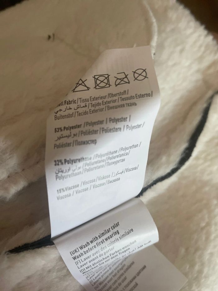 Simili cuir noir à l’extérieur Moumoute blanche à l’intérieur Fermeture éclaire Un peu oversize