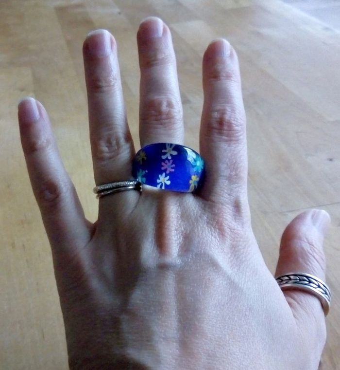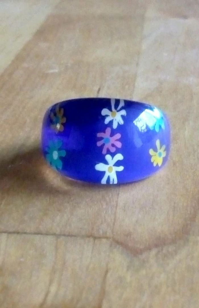 Bague fantaisie en plastique transparent décor bleu à fleurs multicolores ▶️ Voir tous mes bijoux en vente : #n1n13bijoux