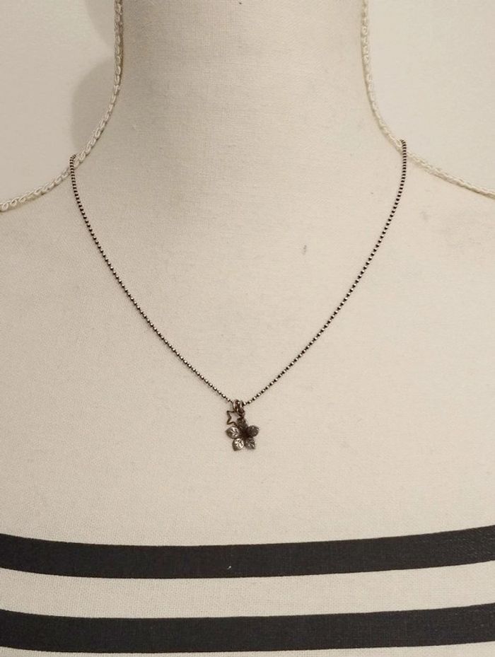 Collier de marque Carry Simone Paris Chaine bille argentée à fermoir mousqueton Longueur 45 cm Pendentif fleur argentée Pendentif petite étoile dorée Breloque signature sur l'anneau du fermoir ▶️ Tous mes bijoux en vente : #n1n13bijoux