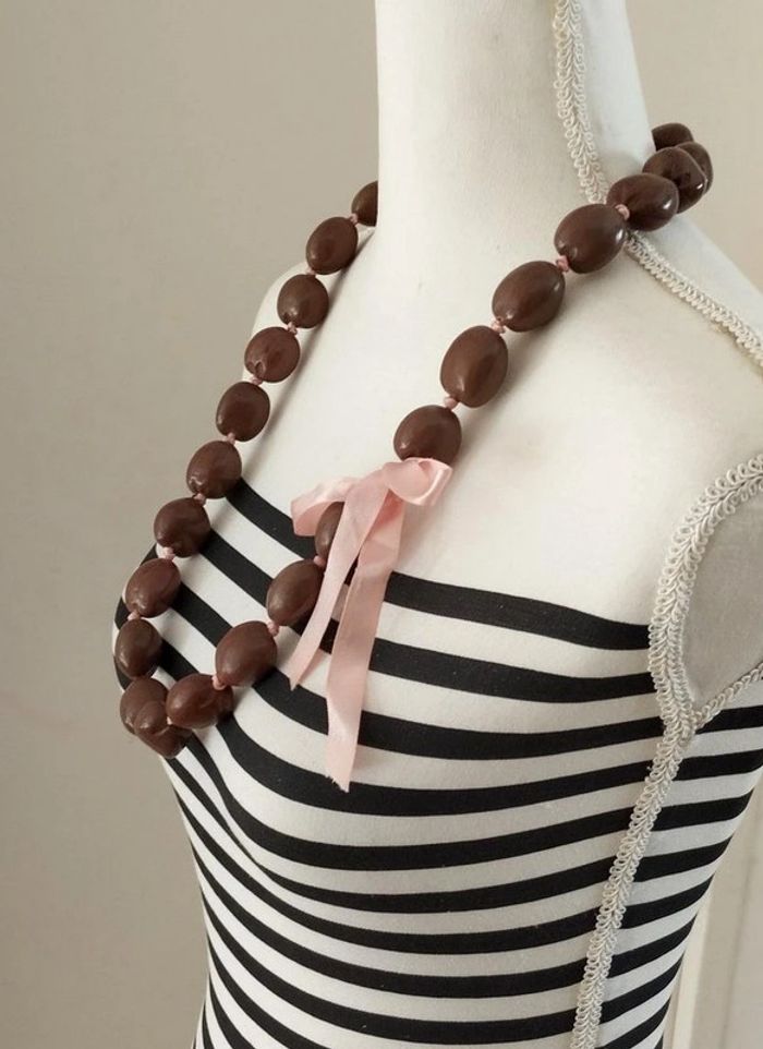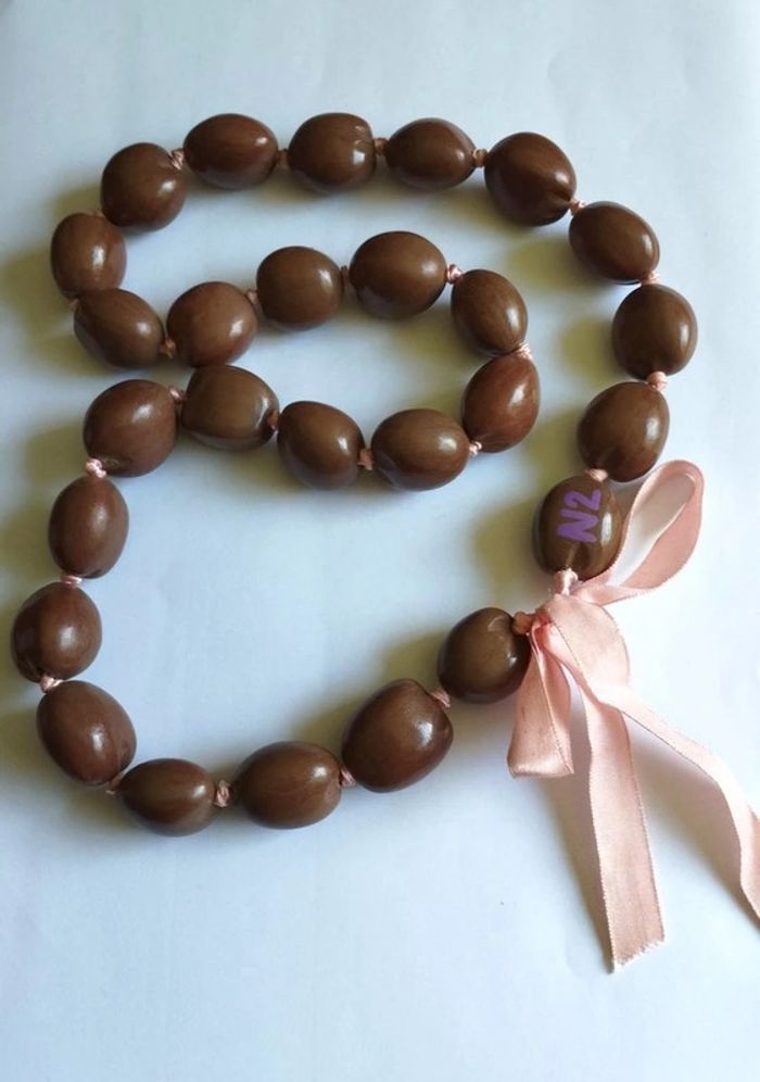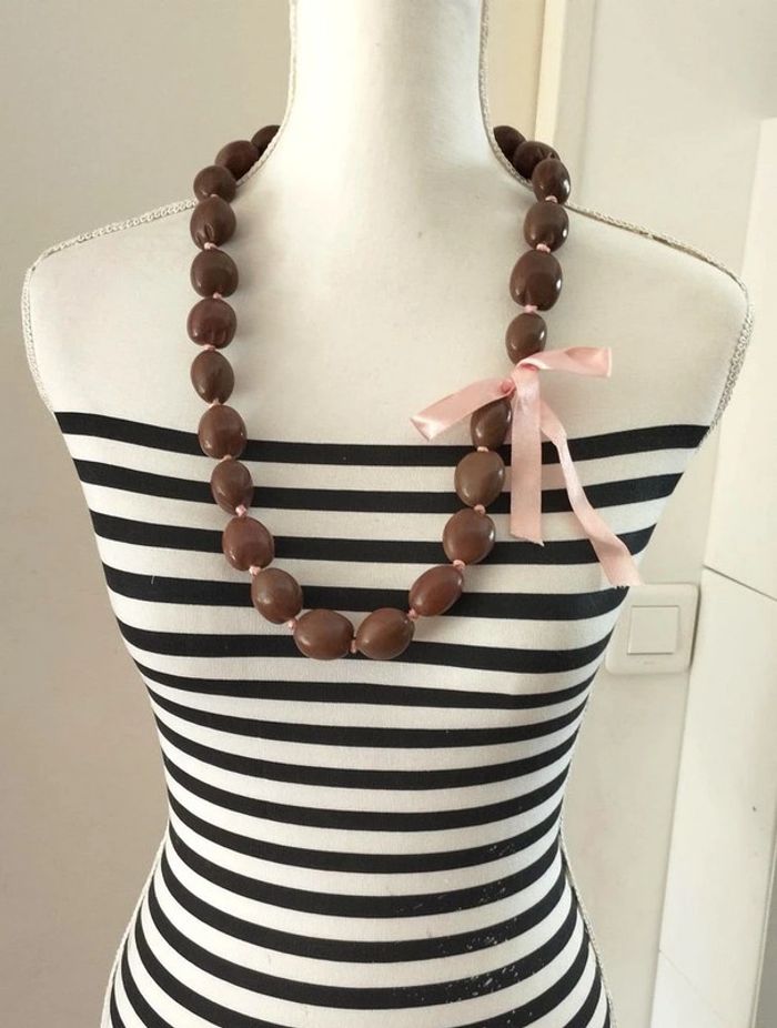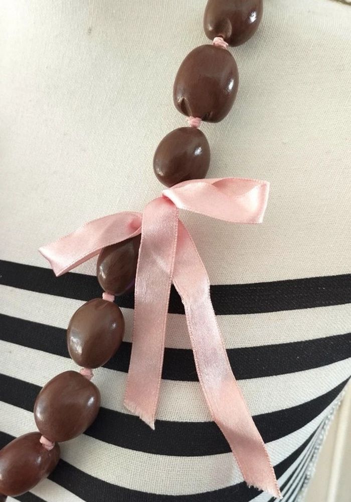 Collier fantaisie de marque N2 Grosses perles de bois marron montées sur un ruban de satin rose clair Signature N2 sur une perle ▶️ Voir tous mes bijoux en vente : #n1n13bijoux