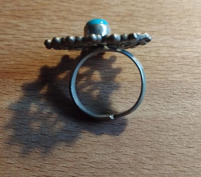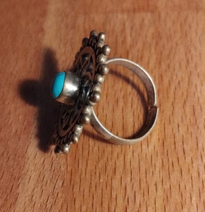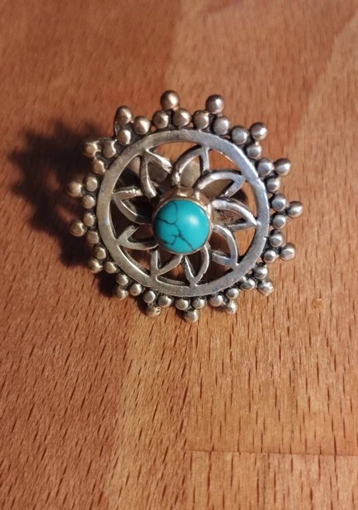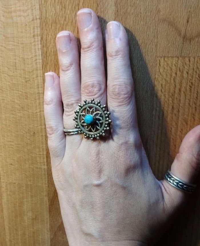 Bague réglable de style boho en métal entre argenté et doré motif mandala ajouré décoré au milieu d'une résine bleue marbrée effet turquoise Bijou fantaisie acheté sur un marché au puces à Londres ▶️ Voir tous mes bijoux en vente : #n1n13bijoux