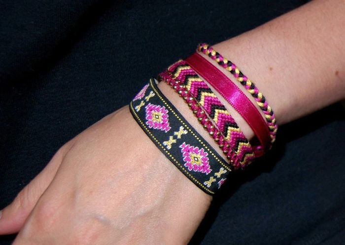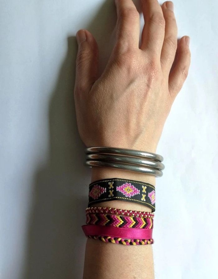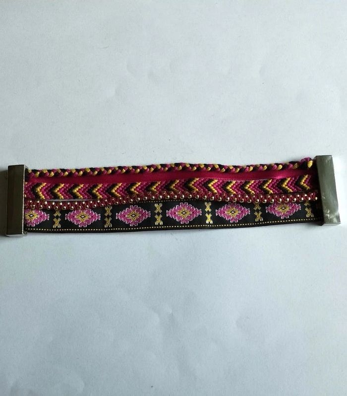 Manchette brésilienne multi-rangs composée : - d'un galon noir aux motifs brodés jaunes et roses, soulignés de blanc - de fils de billes dorées reliés par un rose foncé - d'un bracelet brésilien aux tons jaune, rose, pourpre et noir, motifs chevrons - d'un ruban de satin pourpre - d'une tresse de fils aux coloris assortis. Le tout est monté sur un fermoir aimanté. Longueur : 17 cm (un peu grand pour moi) ▶️ Voir tous mes bijoux en vente : #n1n13bijoux