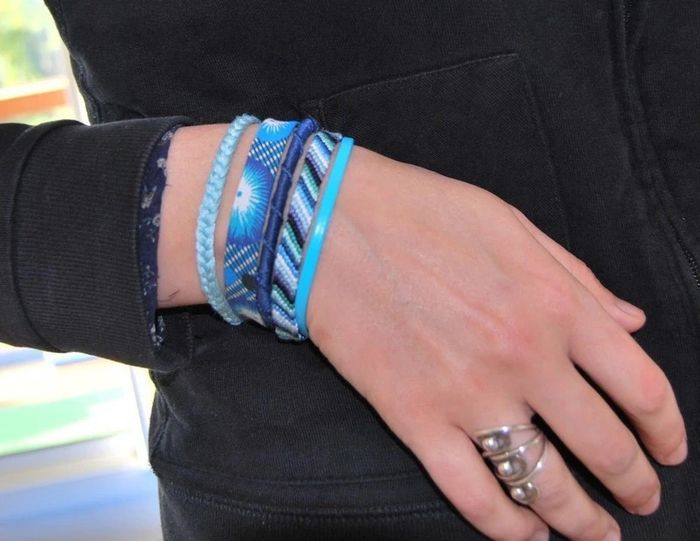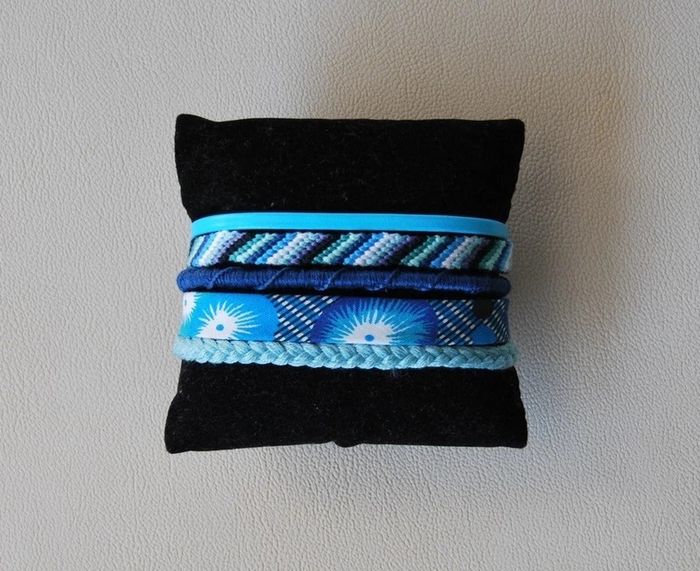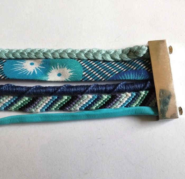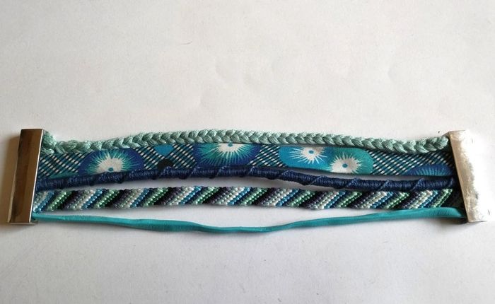 Manchette brésilienne multi-rangs composée : - d'un lien de simili cuir bleu, - d'un bracelet brésilien tons bleu, turquoise, bleu-vert, - d'un bracelet brésilien spirale bleu marine, - d'un ruban de tissus fleuri, - d'une tresse de fils vert d'eau. Le tout est monté sur un fermoir aimanté argenté. Longueur : 18,5 cm ▶️ Voir tous mes bijoux en vente : #n1n13bijoux
