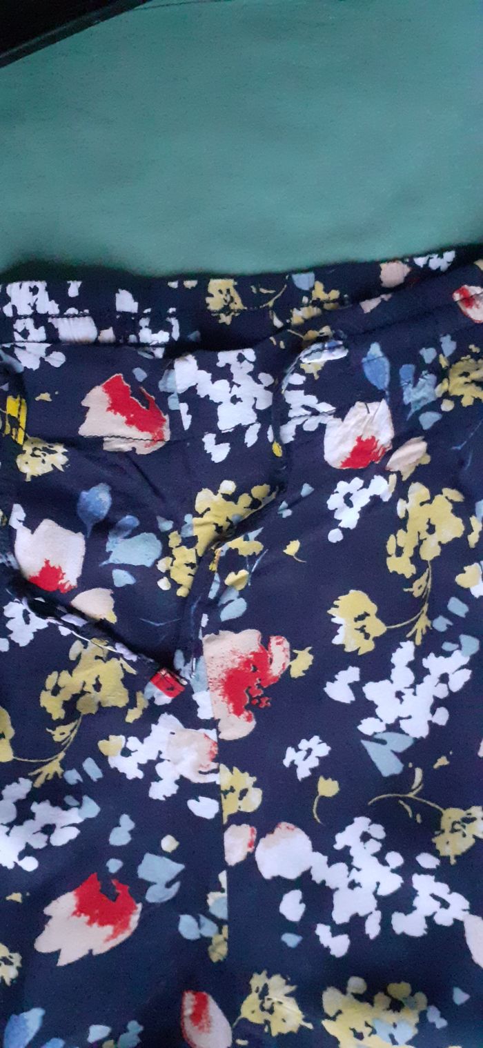 Vends un short fluide 100 % viscose, 2 poches latérales, fond bleu marine avec fleurs multicolores, taille M. Longueur sur le côté : 32,5 cm.