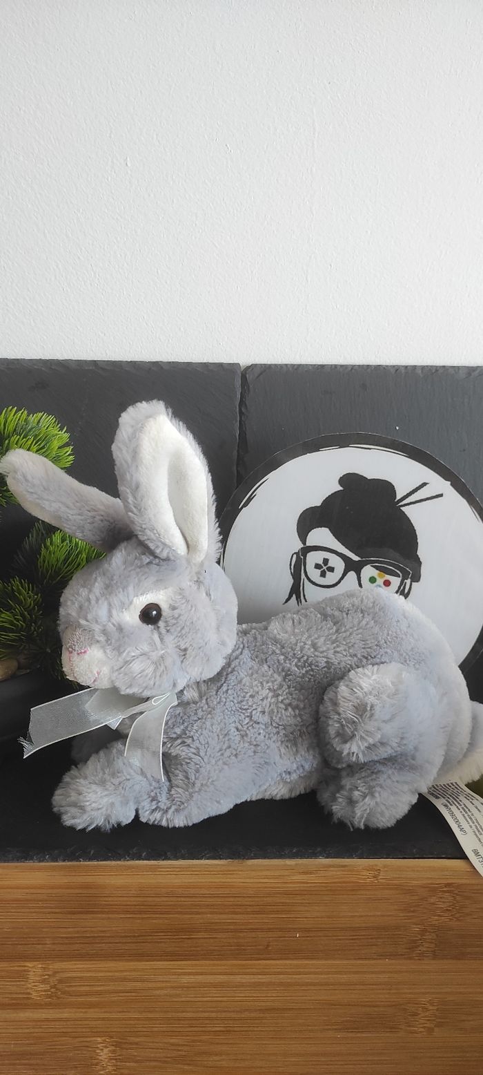 peluche doudou lapin gris blanc noeud satin couché toys global ltd doux - photo numéro 1