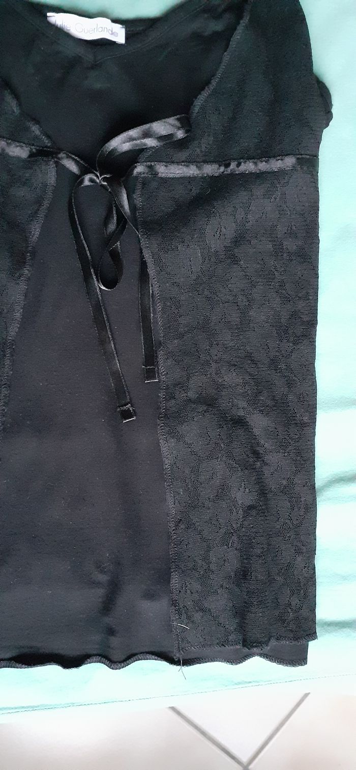 Vends un caraco à fines bretelles, 95 % viscose, 5 % élasthanne, 2 pans en dentelle devant et ruban satiné, couleur noir, marque Julie Guerlande, taille 1. Longueur sous aisselle : 38 cm.