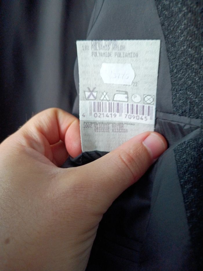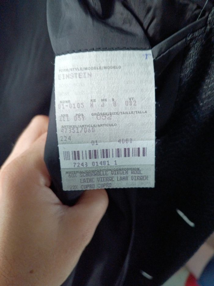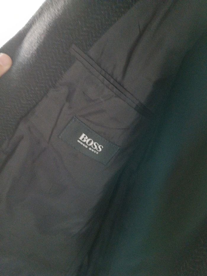 Veste de costume Boss taille 52 en laine vierge coloris noir Longueur 75 cm largeur aux épaules 52 cm. Article authentique acheté à la boutique tolub Metz. En excellent état avec 1 bouton de rechange fourni en cas de besoin.