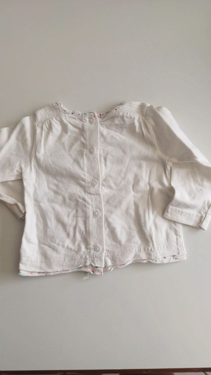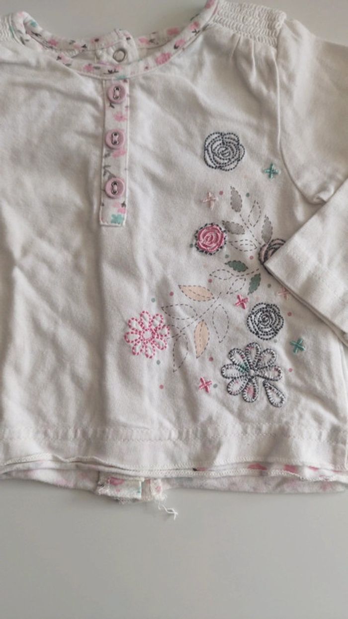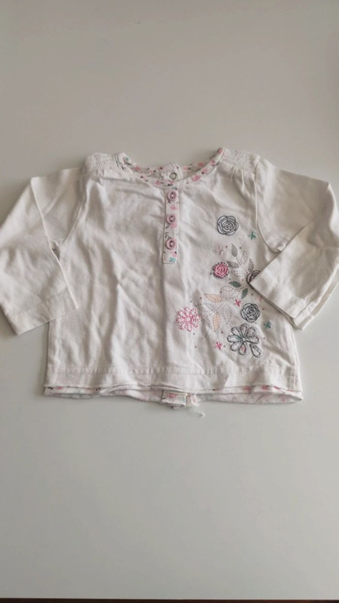 Tee-shirt manche longue Blanc et motif fleurs Pressions dans le dos- Coton Très bon état Gémo 3 mois