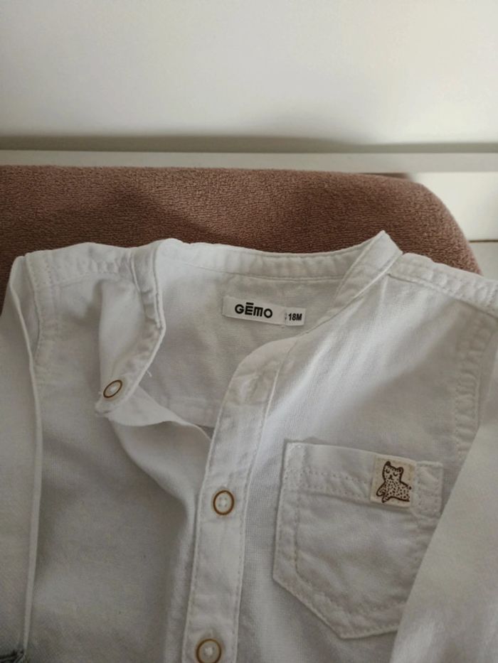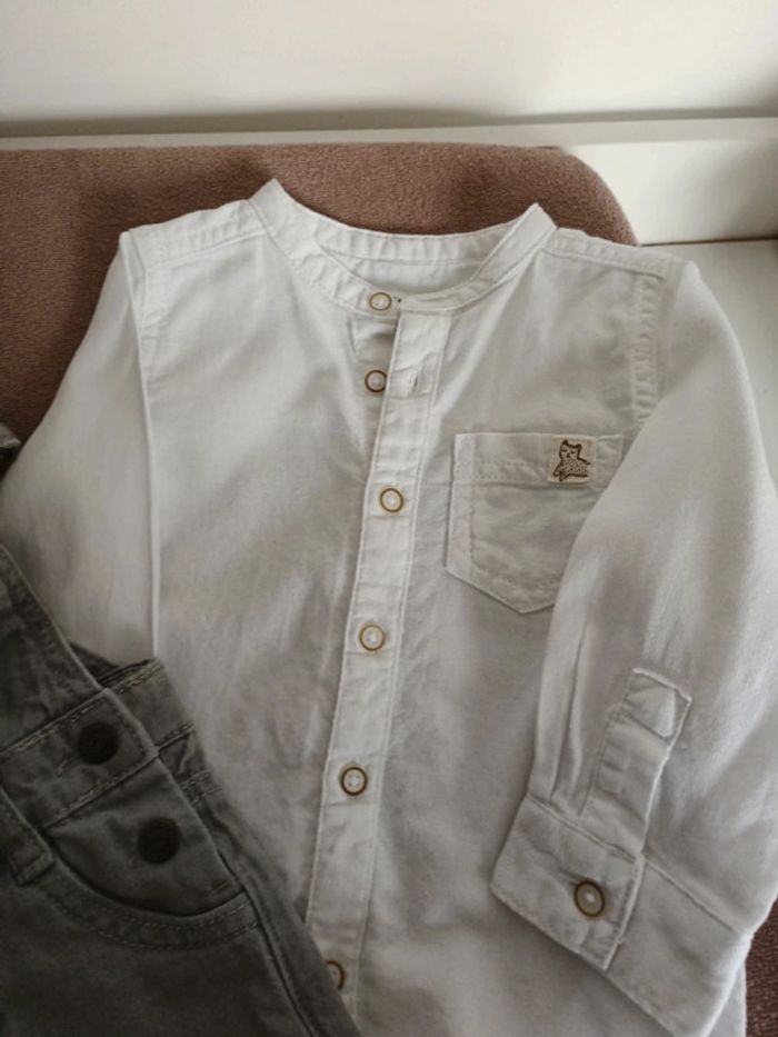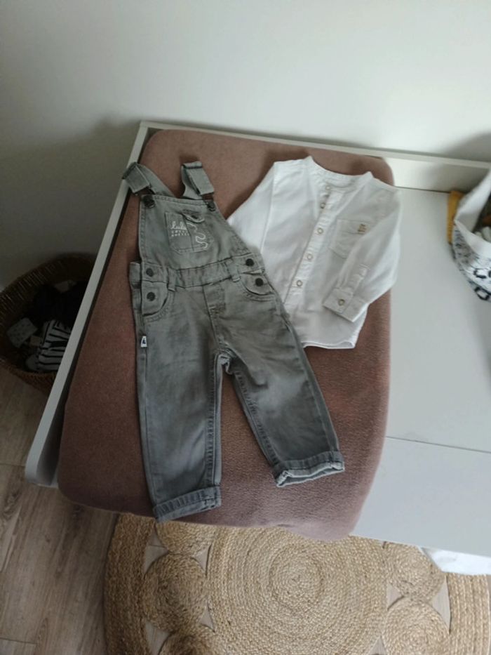 Salopette grise en jean Chemise blanche Lulu castagnette et Gémo 18 mois