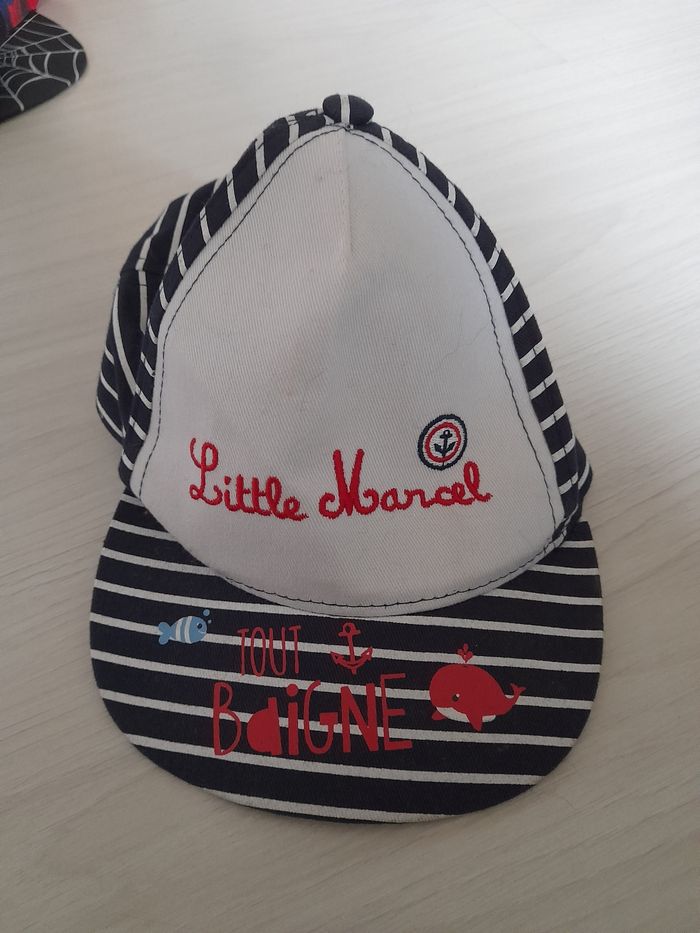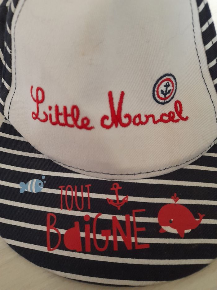 Casquette T 6/12 mois Marque LITTLE MARCEL Couleur bleu marine et blanc Attache velcro à l'arrière 100 % coton Très très bon état