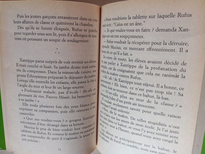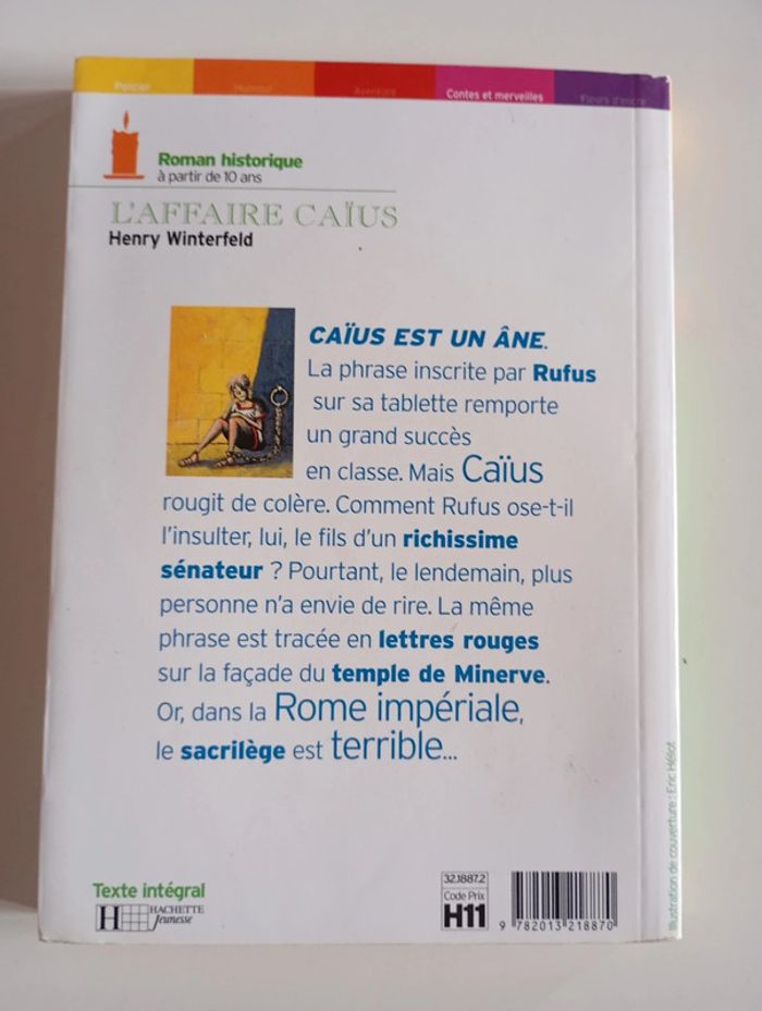 CAÏUS EST UN ÂNE. La phrase inscrite par Rufus sur sa tablette remporte un grand succès en classe. Mais Caïus rougit de colère. Comment Rufus ose-t-il l'insulter, lui, le fils d'un richissime sénateur ? Mais le lendemain, plus personne n'a envie de rire. La même phrase est tracée en lettres rouges sur la façade du temple de Minerve. Or, dans la Rome impériale, le sacrilège est terrible. 256 pages Âge de lecture ‏ : ‎ 8 - 11 ans Dimensions ‏ : ‎ 12.5 x 1.2 x 18 cm Livre en très bon état Je vends d'autres romans historiques #phil_peg_romanhistorique #romanhistorique #rome #italie #antiquité