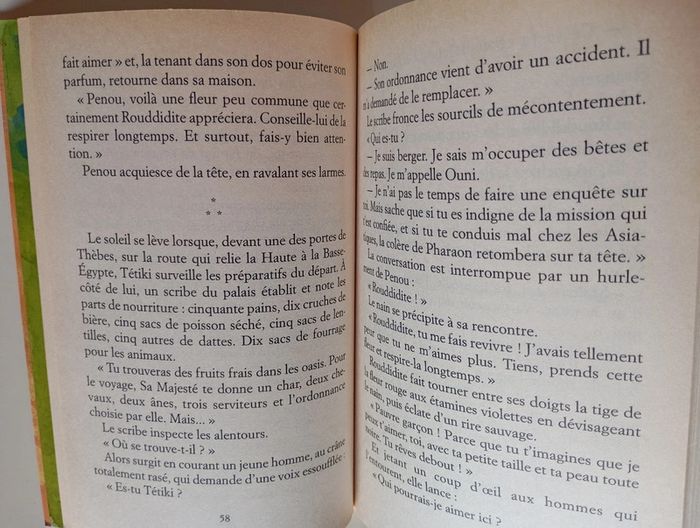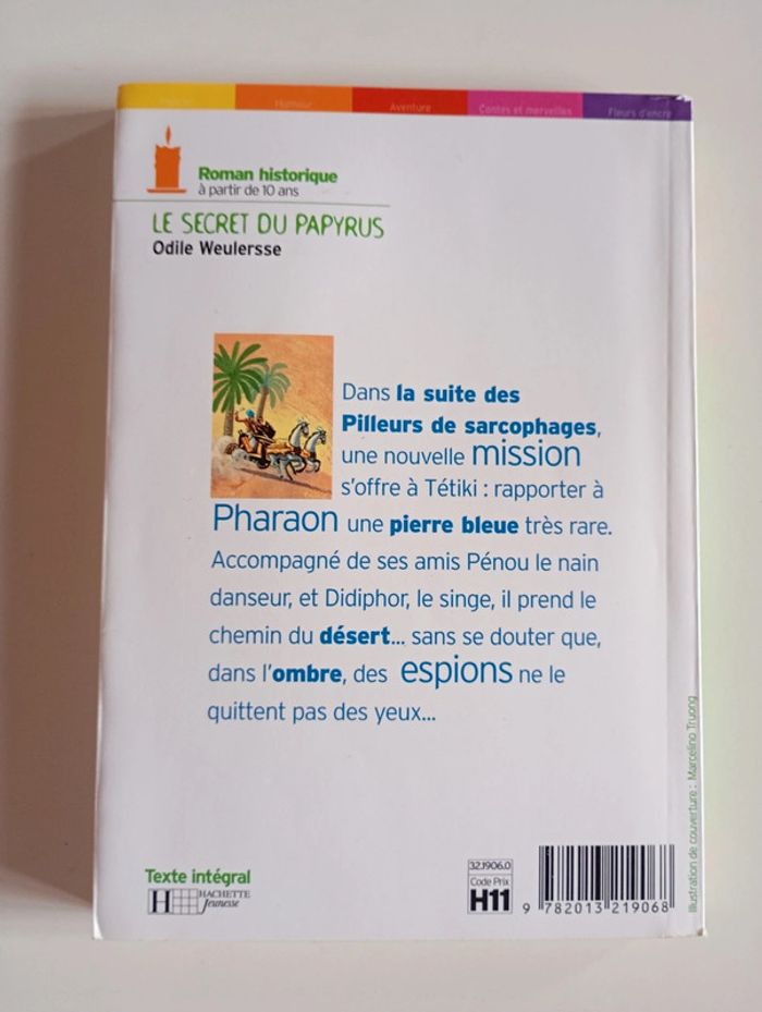 Dans la suite des Pilleurs de sarcophages, une nouvelle mission s'offre à Tétiki : rapporter à Pharaon une pierre bleue très rare. Accompagné de ses amis Pénou le nain danseur, et Didiphor, le singe, il prend le chemin du désert... sans se douter que, dans l'ombre, des espions ne le quittent pas des yeux... Éditeur ‏ : ‎ Livre de Poche Jeunesse 218 pages Âge de lecture ‏ : ‎ 8 - 11 ans Dimensions ‏ : ‎ 12.5 x 1.2 x 18 cm Livre en très bon état Je vends d'autres livres sur l'Egypte #phil_peg_égypte ou d'Odile Weulersse #phil_peg_weulersse #romanhistorique #égypte #odileweulersse