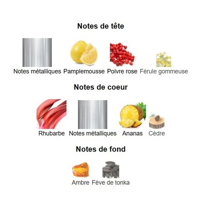 les notes de coeur sont Rhubarbe, Cèdre, Ananas et Notes métalliques