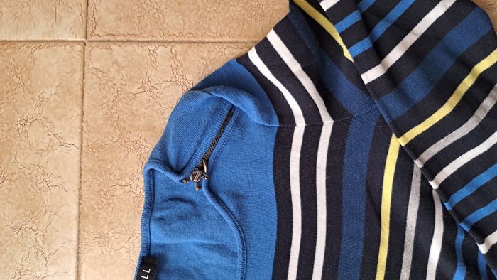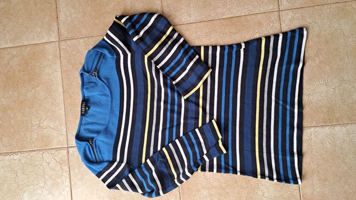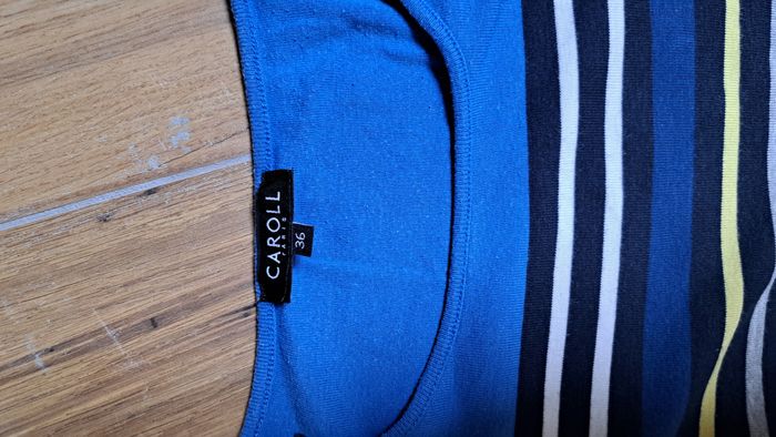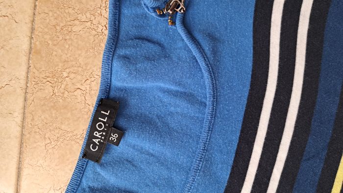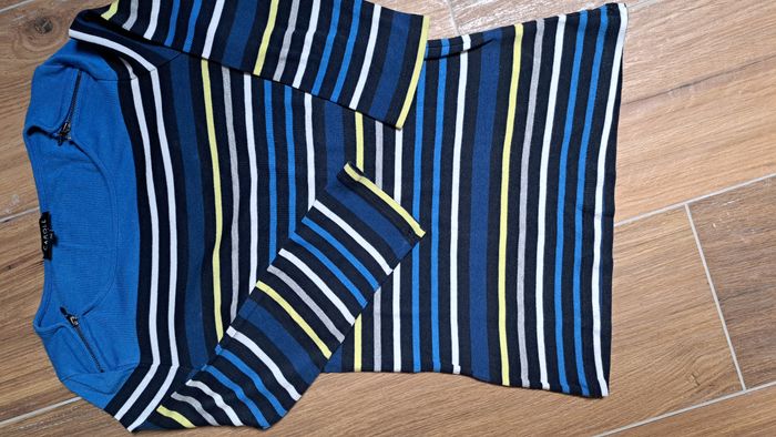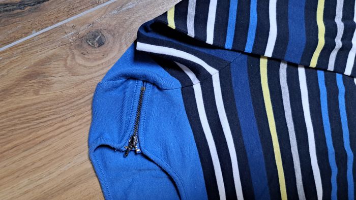 Tee-shirt bleu à rayures. Zip sur l'épaule pour fermeture excellent état. Manches 3/4 Taille 36