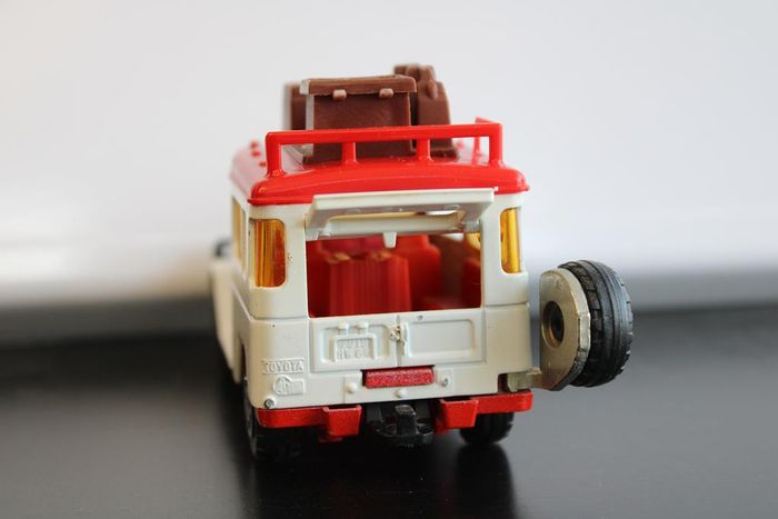 Voiture miniature Toyota Land cruiser . Marque : Toyota Modèle : Land Cruiser BJ40 Echelle : 1:36 Couleur : Blanc, vitrage teinté orange Intérieur : Rouge Chassis : Métal peint en rouge Voiture miniature en bon état. les portes arrière et avant s'ouvrent, un coffre du toit s'ouvre : le petit avec des outils à l'intérieur Les axes de roues ne sont pas tordus Vitrage intact Très rares manques de peinture Des morceaux de la galerie sont manquants. Très beau collector des années 80 Réponds avec plaisir aux demandes d'informations complémentairre Réponse rapide envoi soigné dans les meilleurs délais