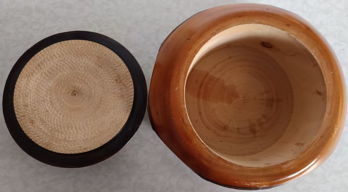 Boite ancienne Ronde en bois vernis avec couvercle mini troncs Diamètre totale: 15,5cm - Hauteur 12cm Diamètre contenance: 10 cm - Hauteur 6cm