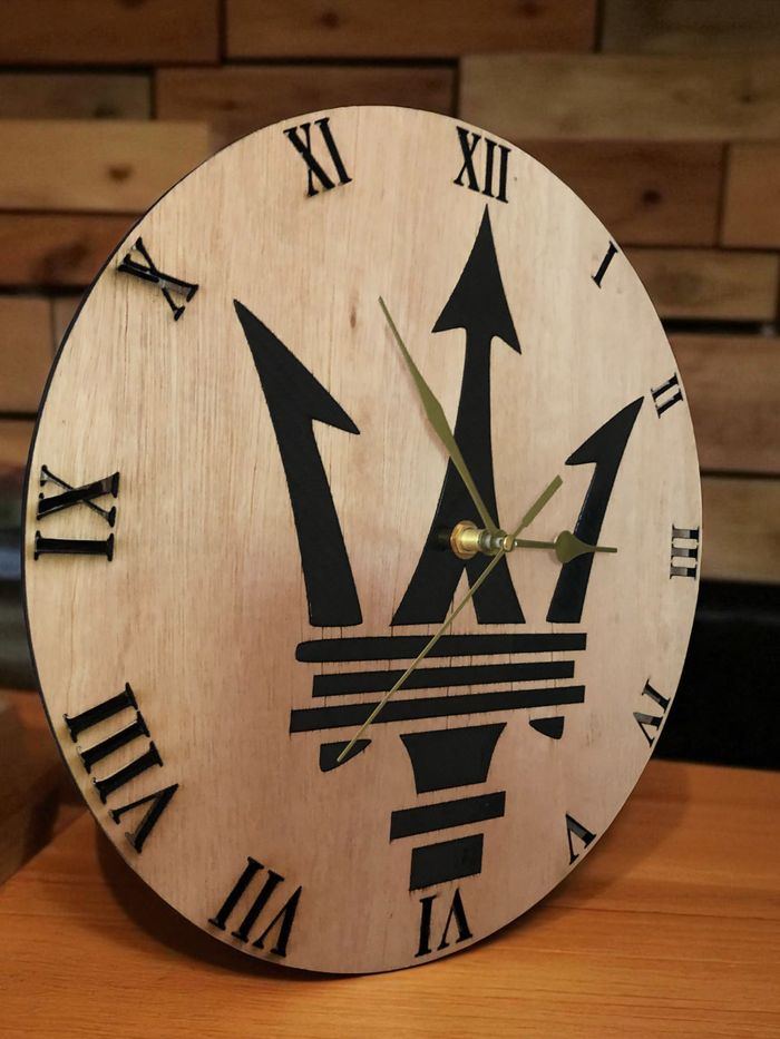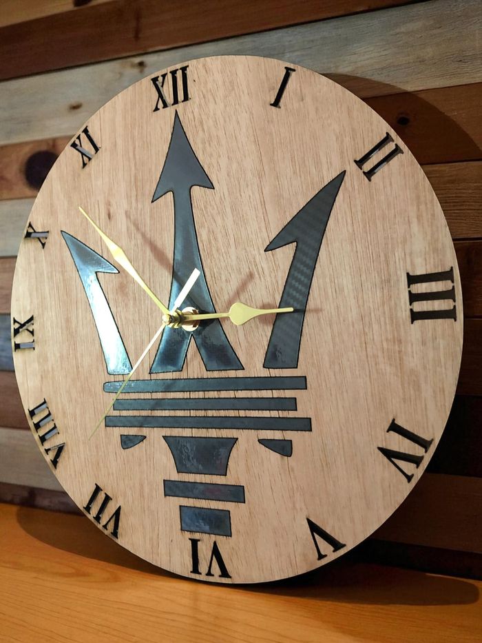 Horloge Maserati en bois neuve avec mécanisme silencieux diamètre 29 cm, recouvert de film carbon