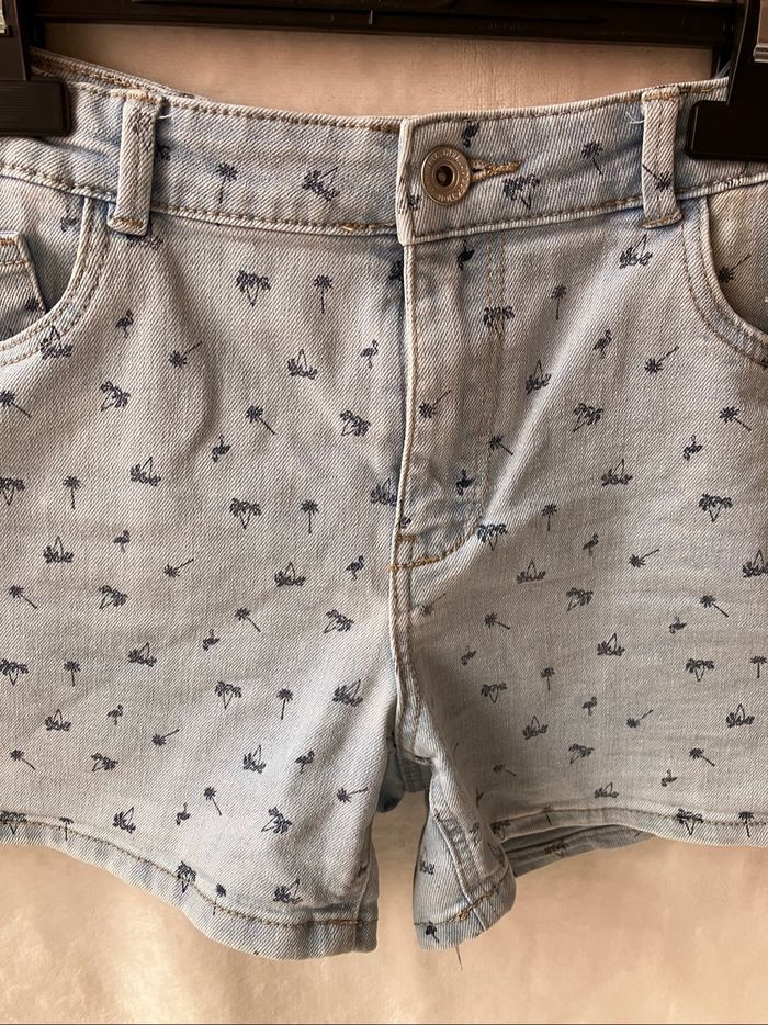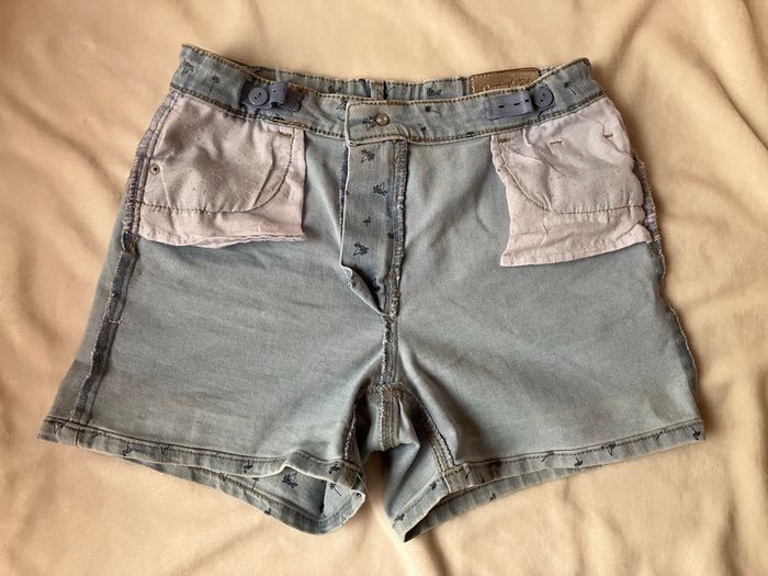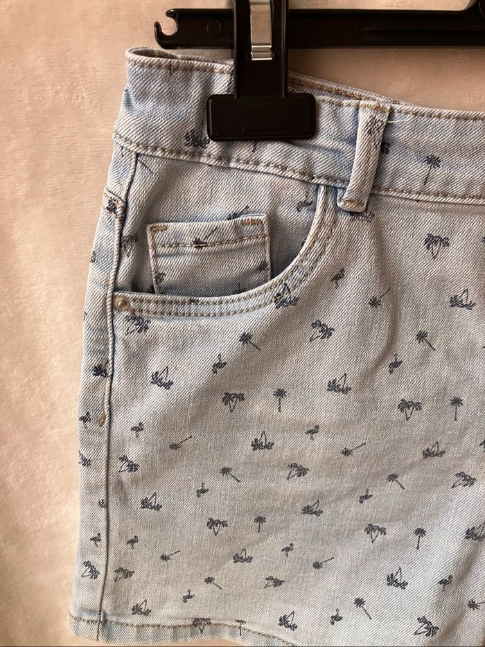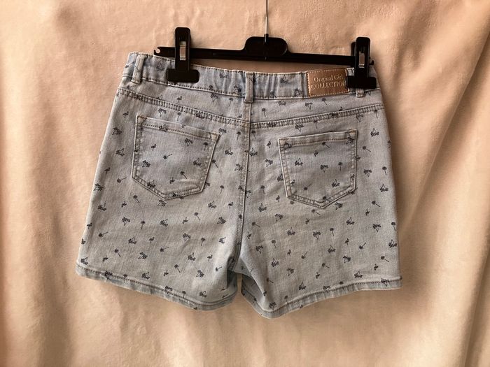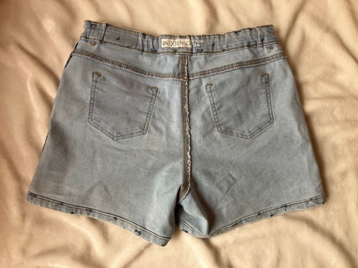 Short bleu ciel In Extenso avec motifs palmiers noté 14 ans (155-161 cm) mais qui conviendra mieux à la taille précédente car ma fille de 14 ans avec mensurations standards n’est plus très à l’aise dedans ~ En bon état, sinon, voir photos ~ Taille réglable ~ Vendu 1€50 ~ Envoi soigné, dressing varié et % activé sur les lots.