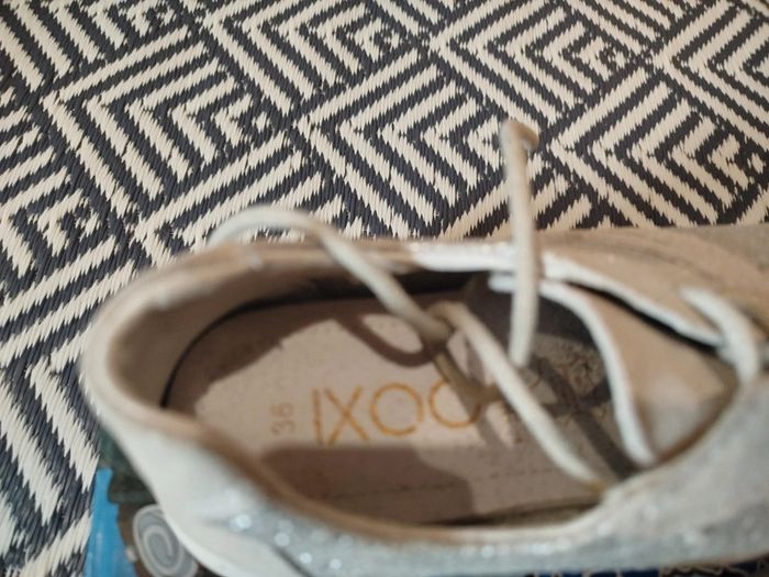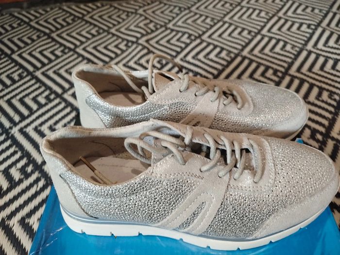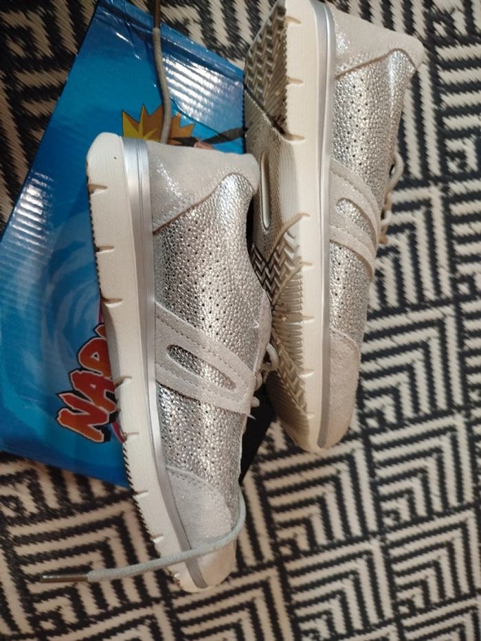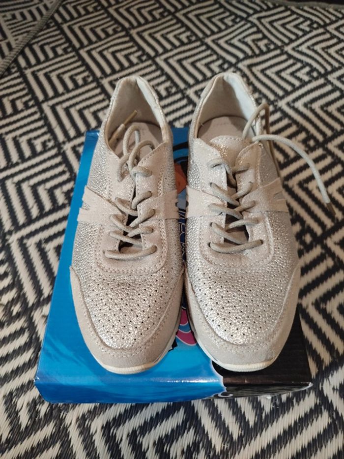 Excellent état, porté une fois. Beige/argenté. Dessus semelle intérieure cuir.