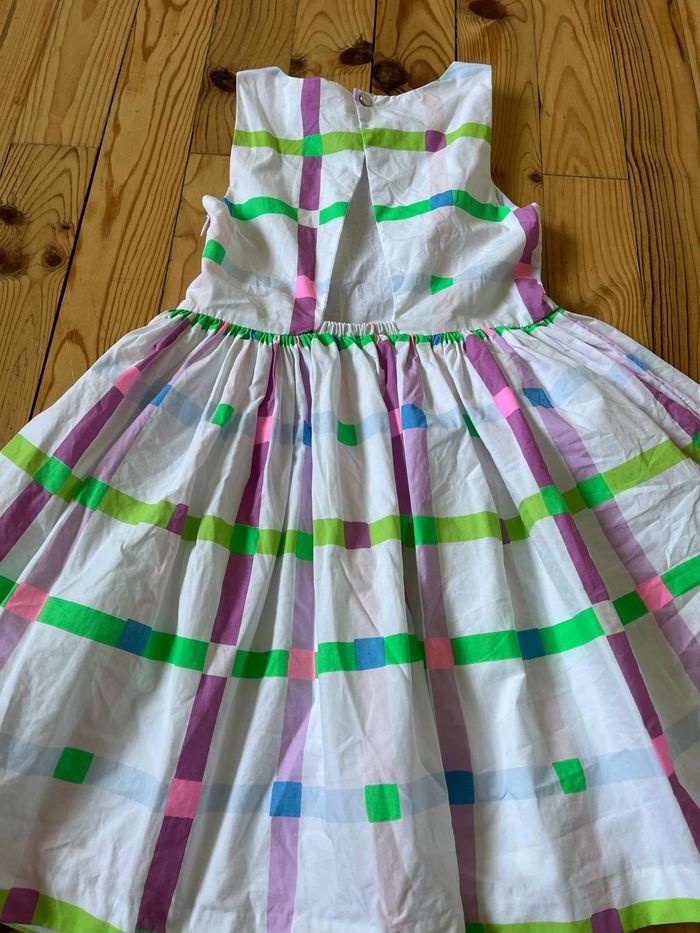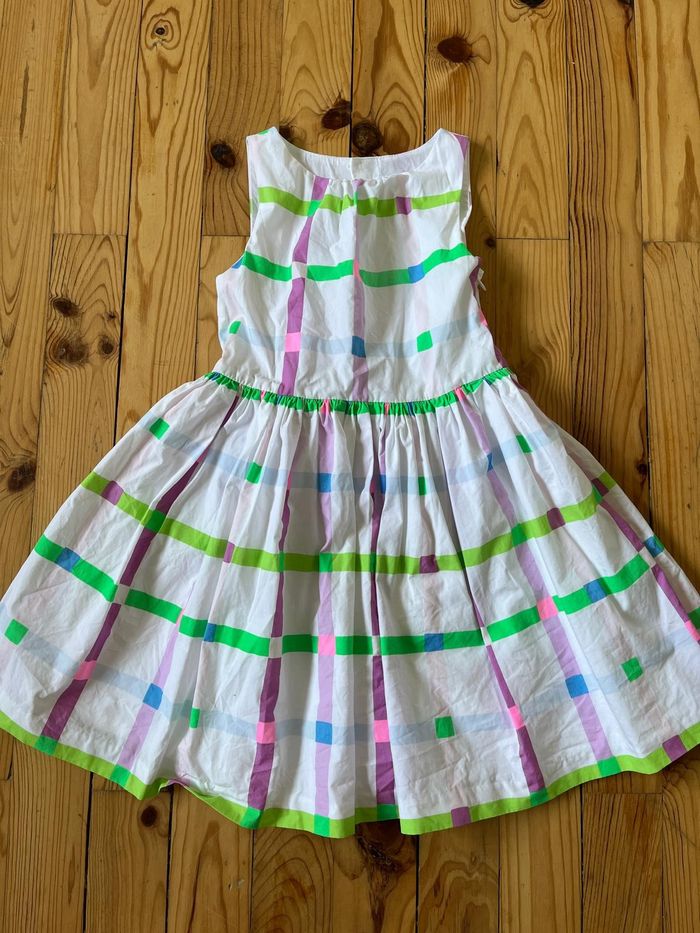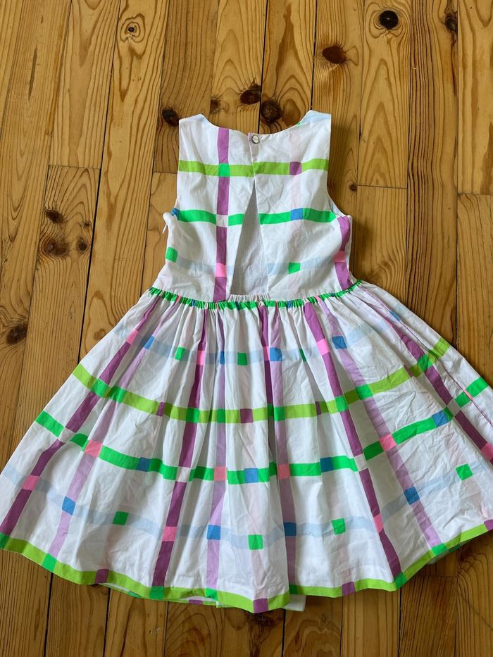 Robe sans manches blanche à lignes vertes et roses. Jamais portée, juste lavée. Présente néanmoins un tout petit point sur le bas près d'une couture, qui ne se voit pas une fois la robe portée.
