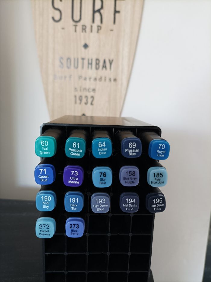 Vends ces feutres tons bleus. Etat neuf. Jamais utilisés. Vendus sans support.