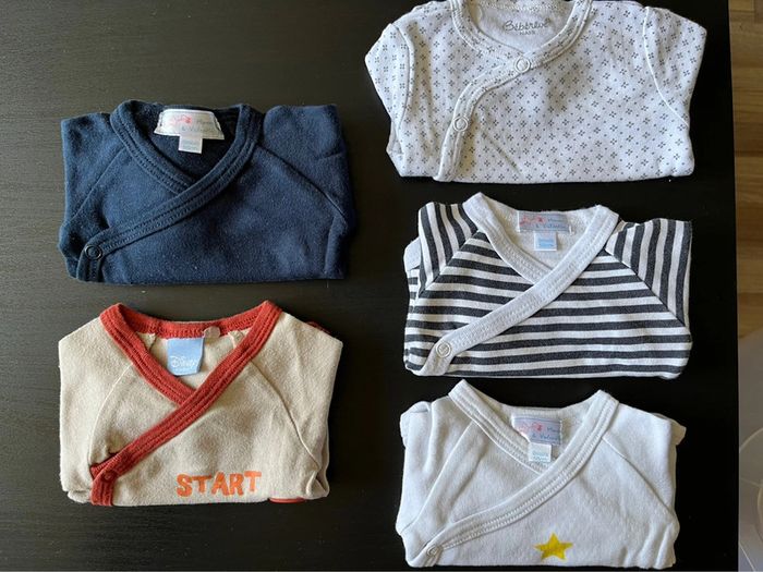 Vends bodies naissance de marques diverses (Maman & Valentin, Dysbey, Bébérêvé).