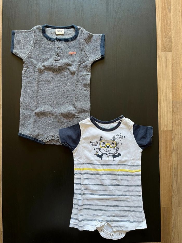 Vends deux combinaisons 6 mois. Très peu portées. La bleue est de la marque Tape à l’œil et la blanche de la marque Gemo. Possibilité d’achat en lot à 4€ ou à l’unité 2,50€.