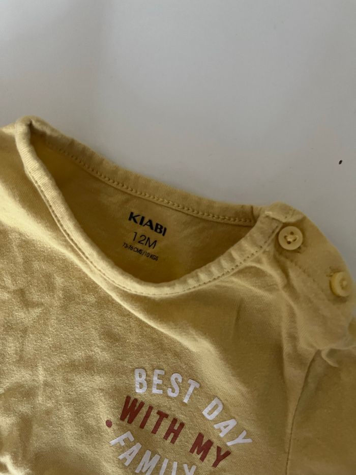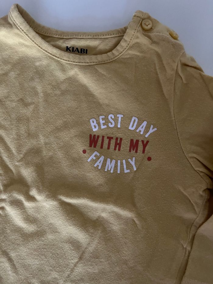 T-shirt manches longues jaune avec écrit best day with my family Marque kiabi Taille 12 mois 73-76cm 10 kilos En très bon état