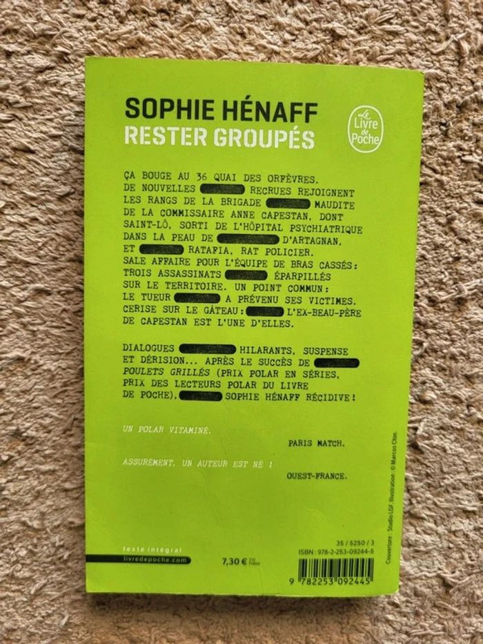 ⭐️ Nombreux livres dans mon dressing réductions sur les lots activées ✨️ 📚 Livre "Rester groupés" de Sophie Hénaff Suite de "Poulets grillés" 📕 On retrouve la brigade loufoque du commandant Anne Capestan, placard de la police parisienne regroupant les « indésirables », qui doit cette fois résoudre une affaire de meurtre embarrassante impliquant un agent des services secrets — tout en restant, comme toujours, « groupés », malgré leurs excentricités 📖 Très bon état 📍 Polar humoristique, à la fois roman policier et comédie de groupe, où l’enquête passe souvent après les relations humaines hautes en couleur