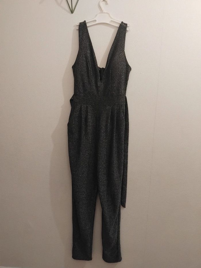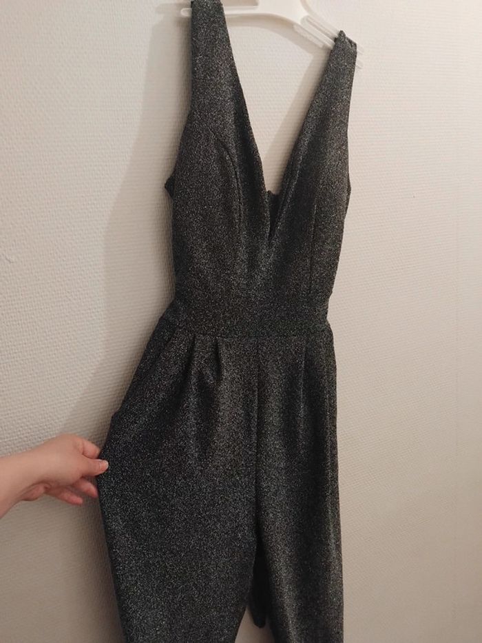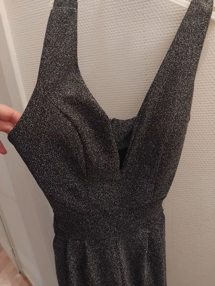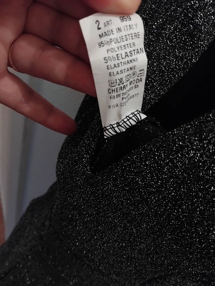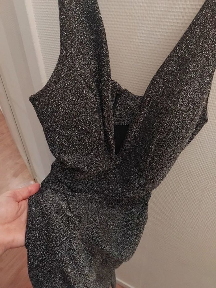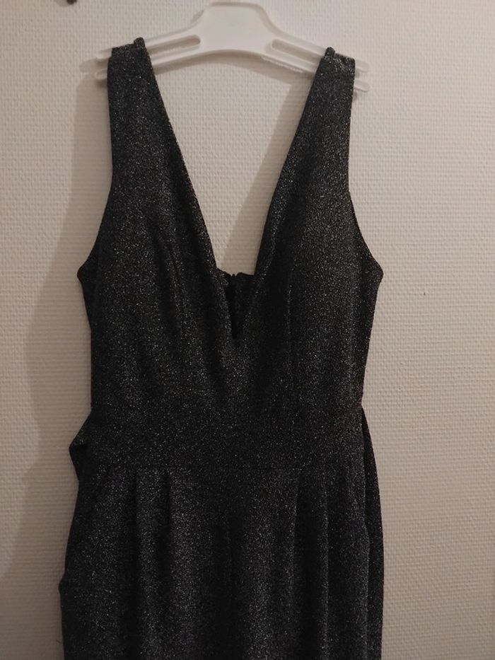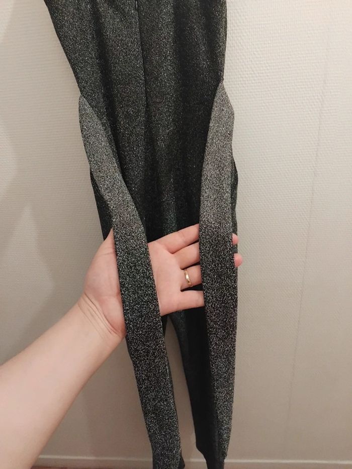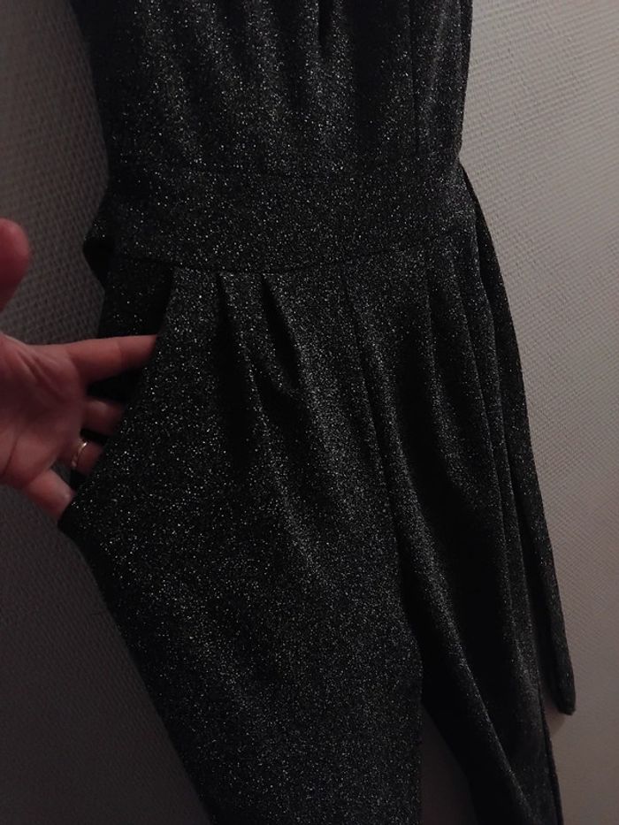 Très jolie combinaison comme neuf porter 2h pr un événement noir pailleté argenté brillant taille 40/42 tissu élastique Il ya la fermeture au dos et deux fil pr ceintré la taille de marque made in italy acheter 170€
