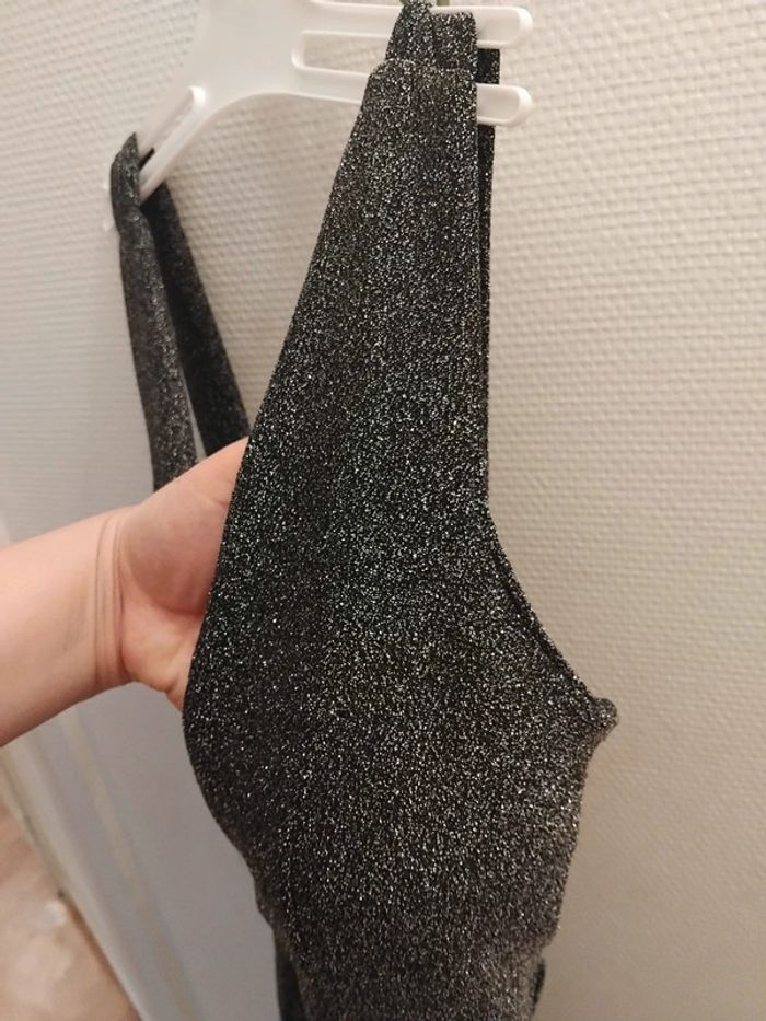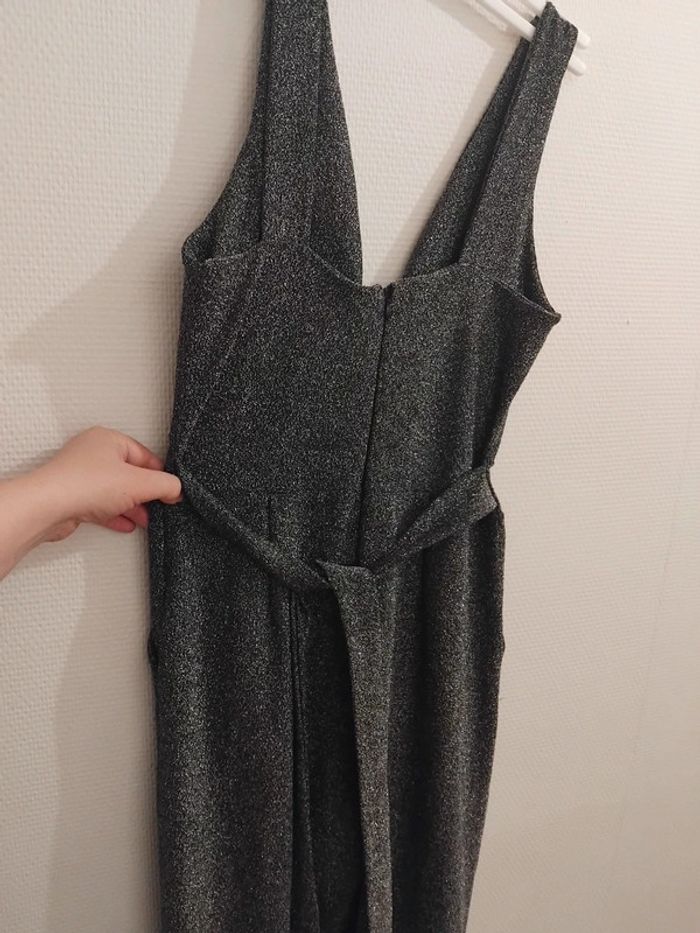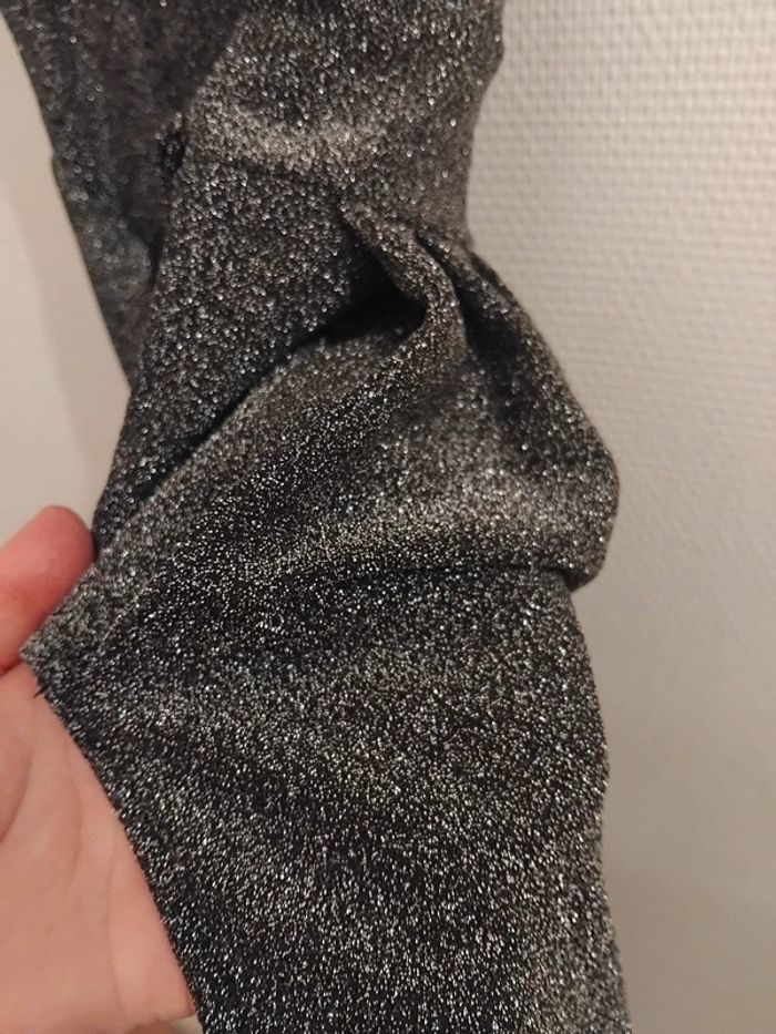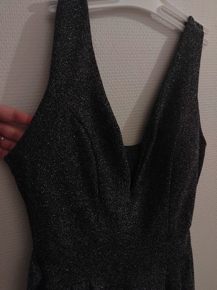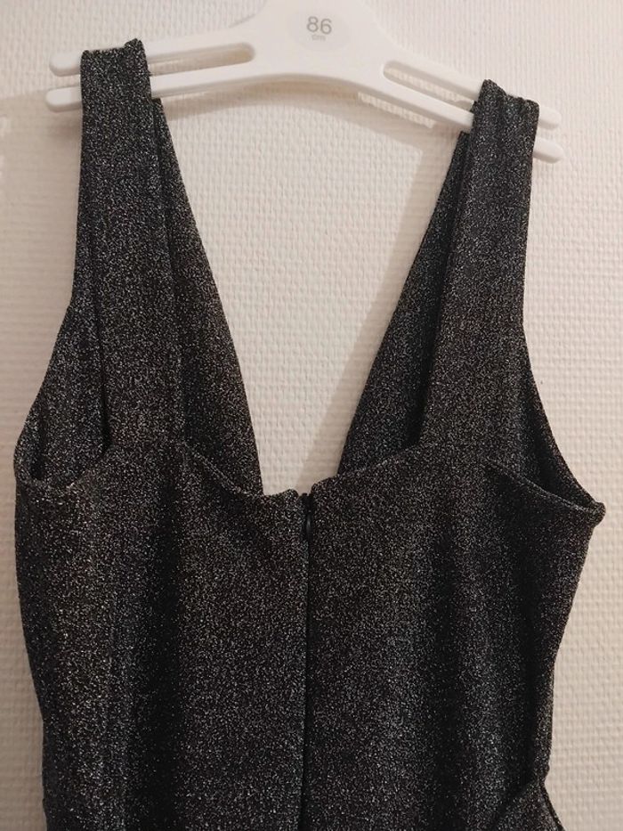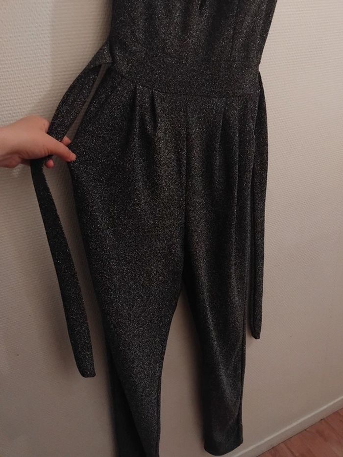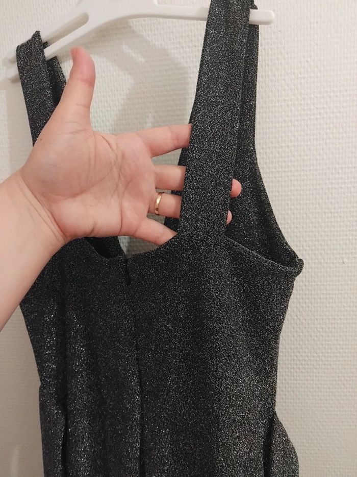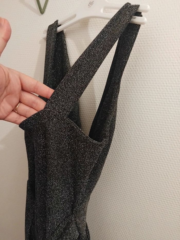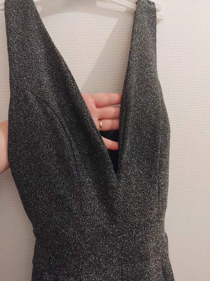Très jolie combinaison comme neuf porter 2h pr un événement noir pailleté argenté brillant taille 40/42 tissu élastique Il ya la fermeture au dos et deux fil pr ceintré la taille de marque made in italy acheter 170€