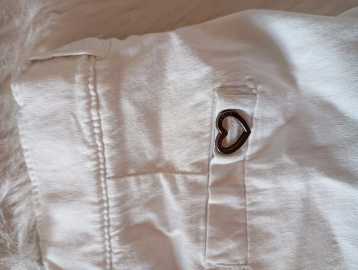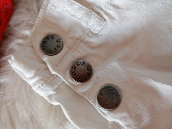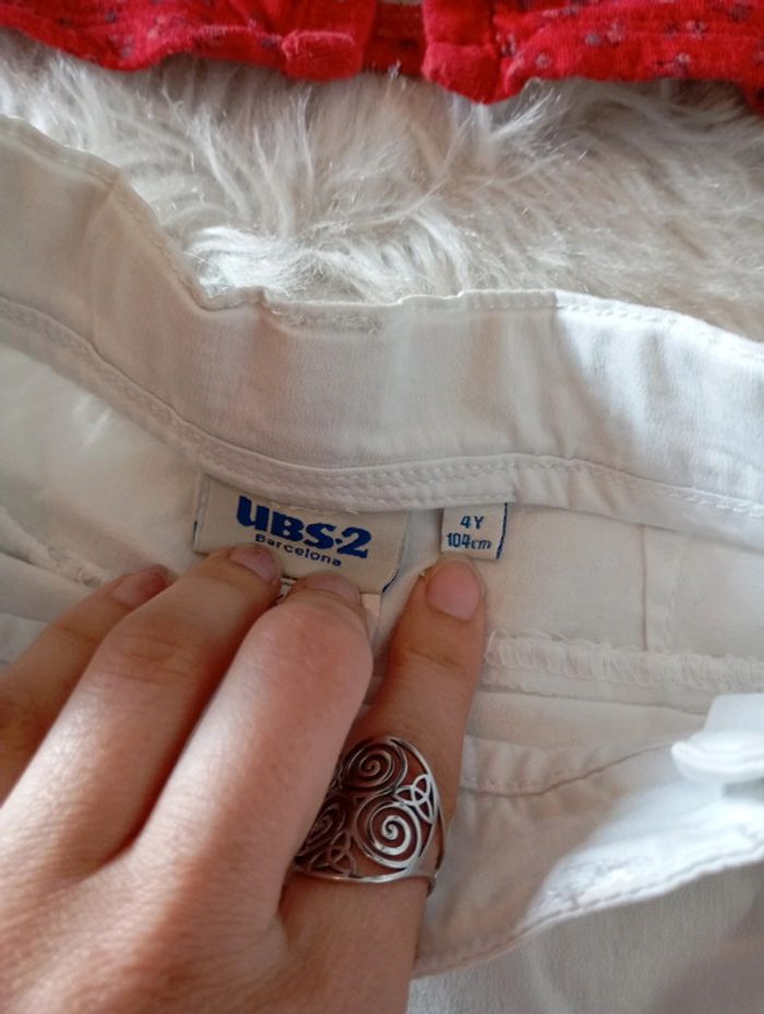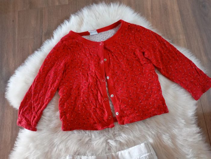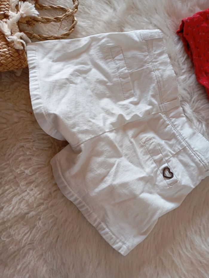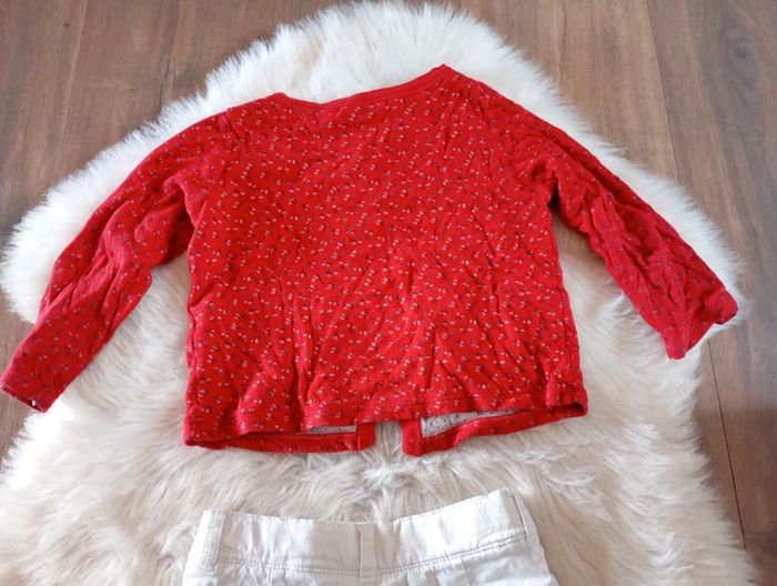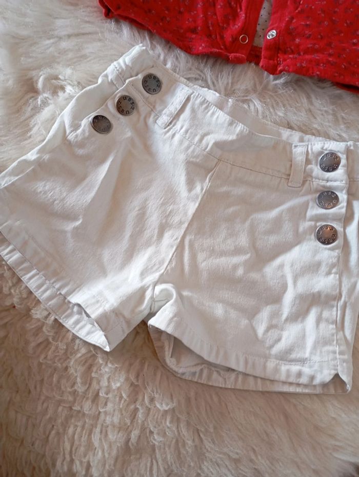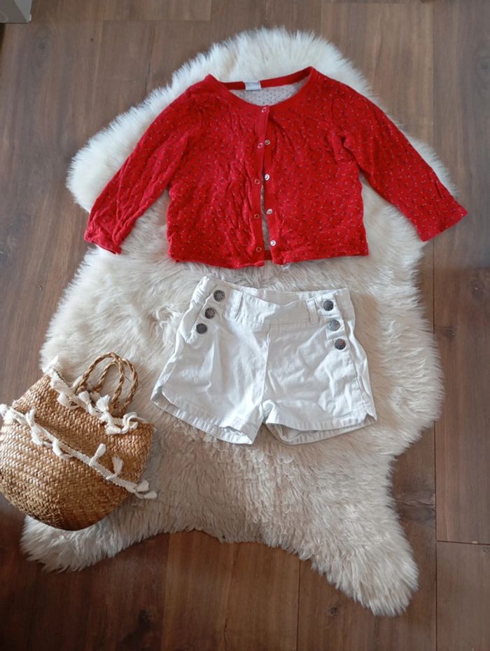 Petite tenue a porter ensemble ou séparément parfaite pour les vacances d'été un petit short blanc de la marque UBS 2 et un petit gilet caradigan imprimé fleuri liberty rouge de la marque Petit bateau le tout en 4 ans