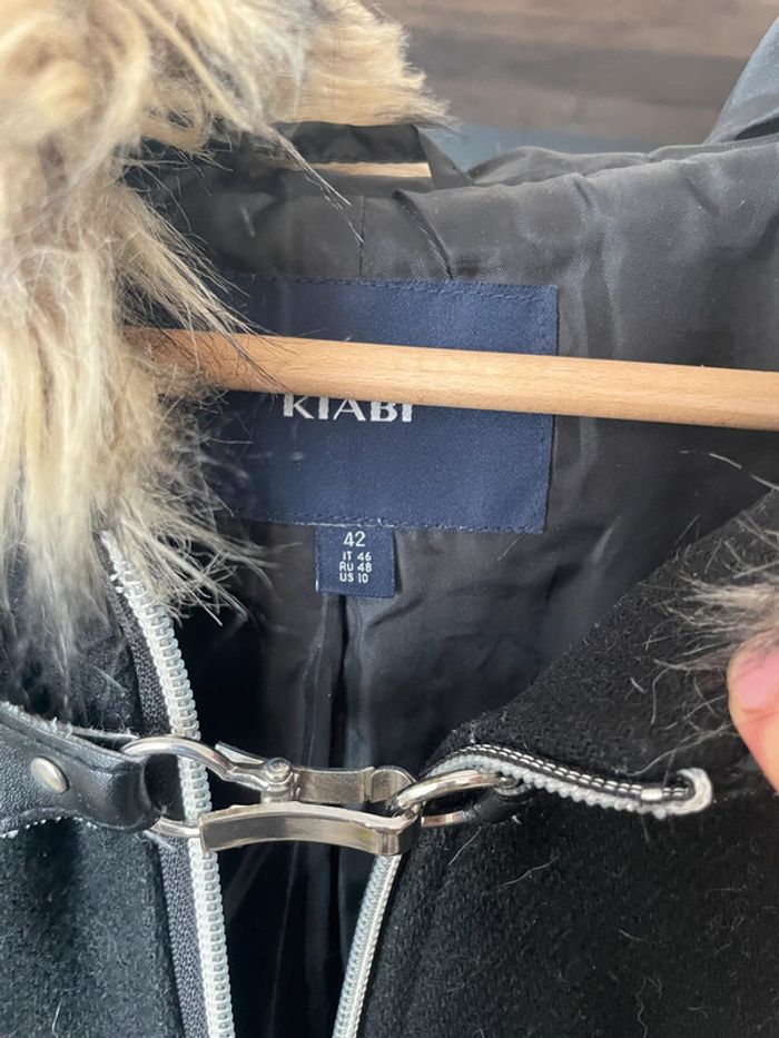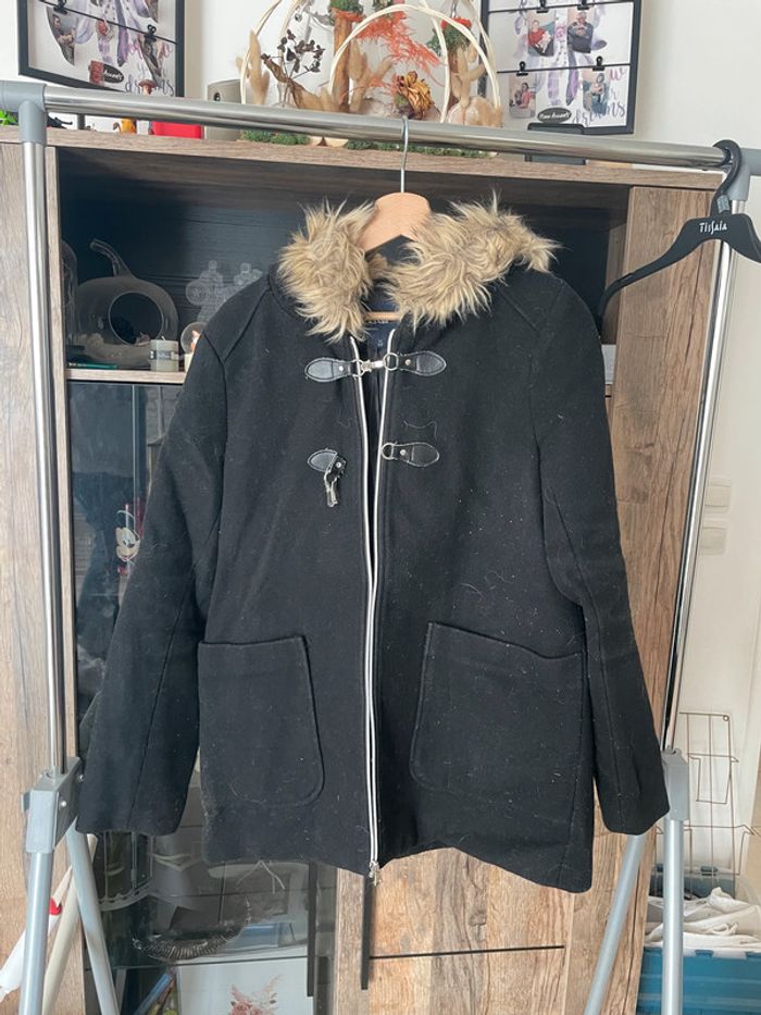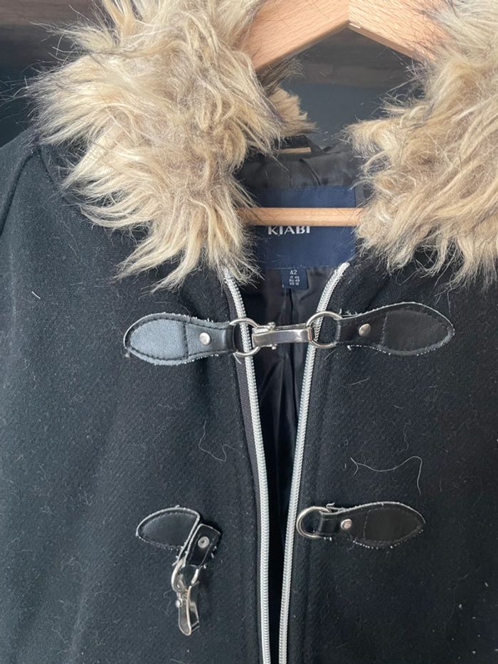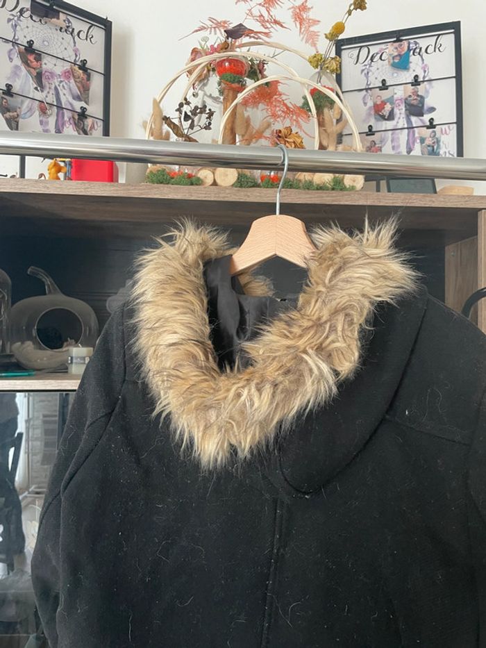 Parka noire effet feutrine. Taille 42. Grandes poches sur le devant.