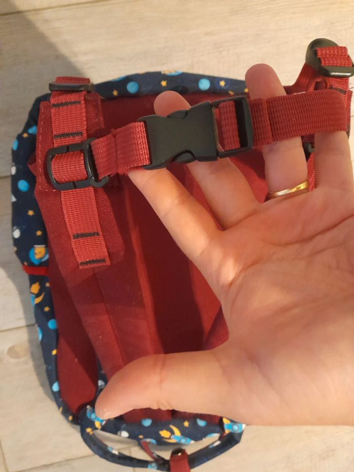 Avec attache au niveau du ventre En très bon état 2 pochettes sur les côtés pour gourde par exemple Une petite pochette sur l'avant et une à l'intérieur #ecolecindy401