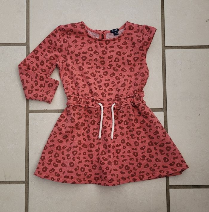 Robe style sweat, tachetée dans les tons rouges, de la marque Kiabi, taille 3 ans (90-97 cm), en très bon état. Article lavé pour la vente.