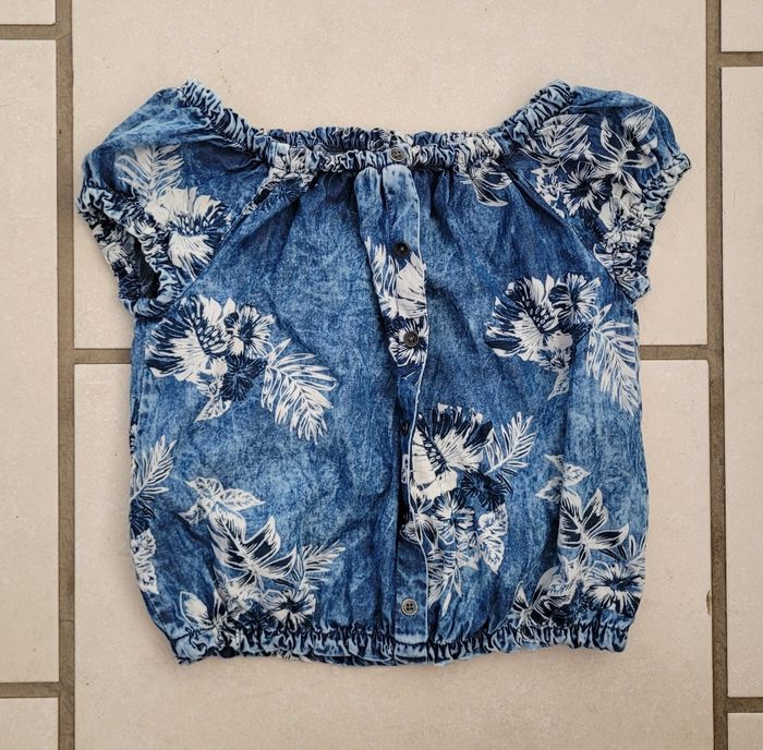 T-shirt manches courtes, fleuri dans les tons bleus et blanc, de la marque U Collection, taille 5 ans (110 cm), en très bon état. Article lavé pour la vente.