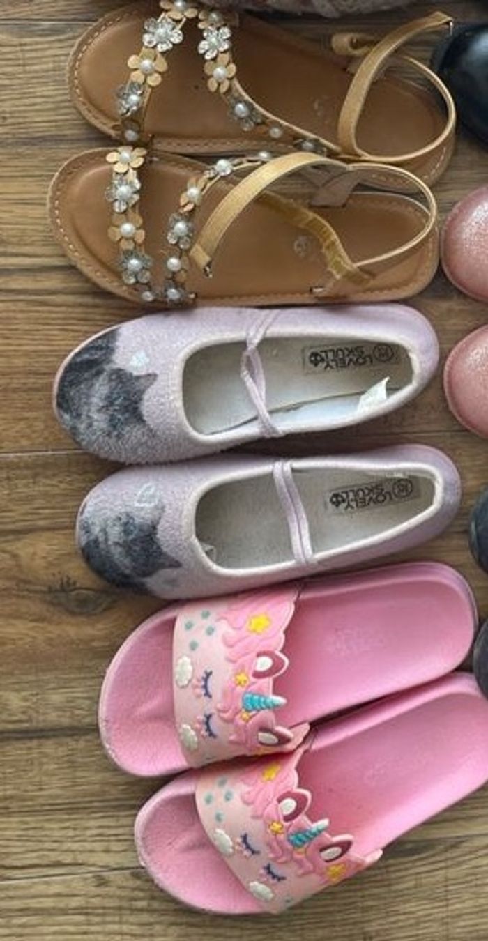 Lot de 3 paires de chaussures fille T 31/32 Une paire : - de sandales quasi neuves - de claquettes licornes roses - de pantoufles rigides