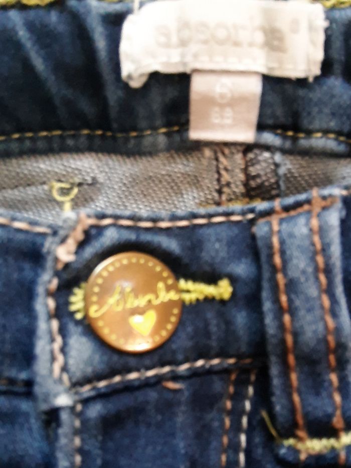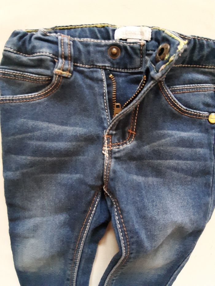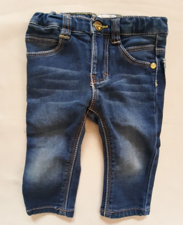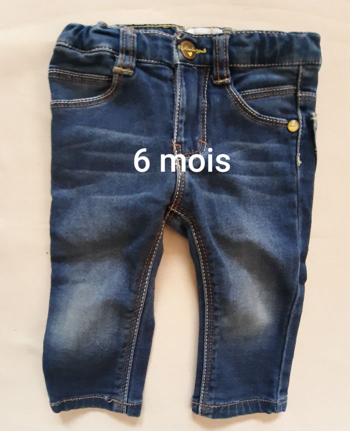 pantalon en jean bleu, de la marque absorba, en taille 6 mois Très confortable car tissu stretch. Taille élastiquée également. Fermeture éclair et bouton pression ok. Vêtements de la taille naissance à la taille 4 ans disponibles. Remise en main propre possible dans le secteur de Pont-Audemer / Beuzeville / Pont-l’Evêque / Epaignes. Envoi possible.