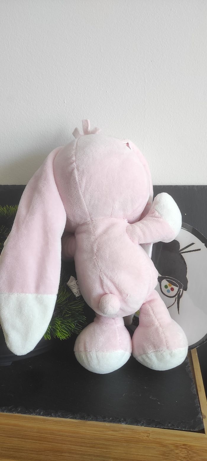 Doudou peluche Lapin rose grandes oreilles coeur fleur Auchan noeud Blanc gris - photo numéro 2