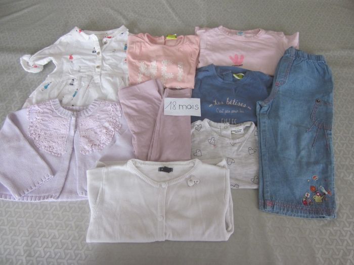 18 mois, jean + 3 hauts ml légers + 1 haut mc + legging + haut ml (transformables en 3/4) + gilet + 2ème gilet offert (tâche), zara, tao, absorba, orchestra