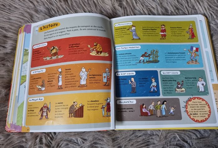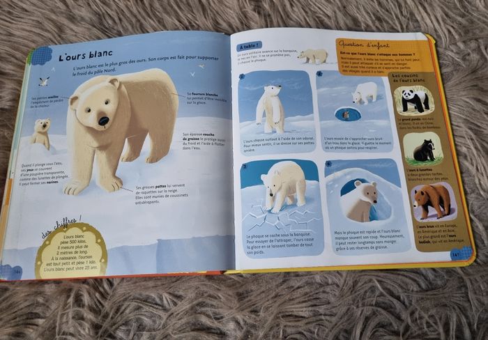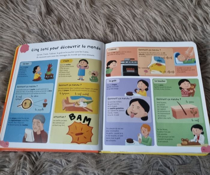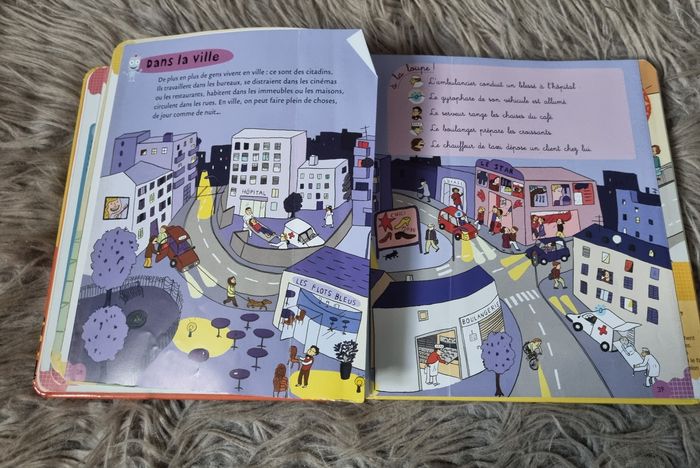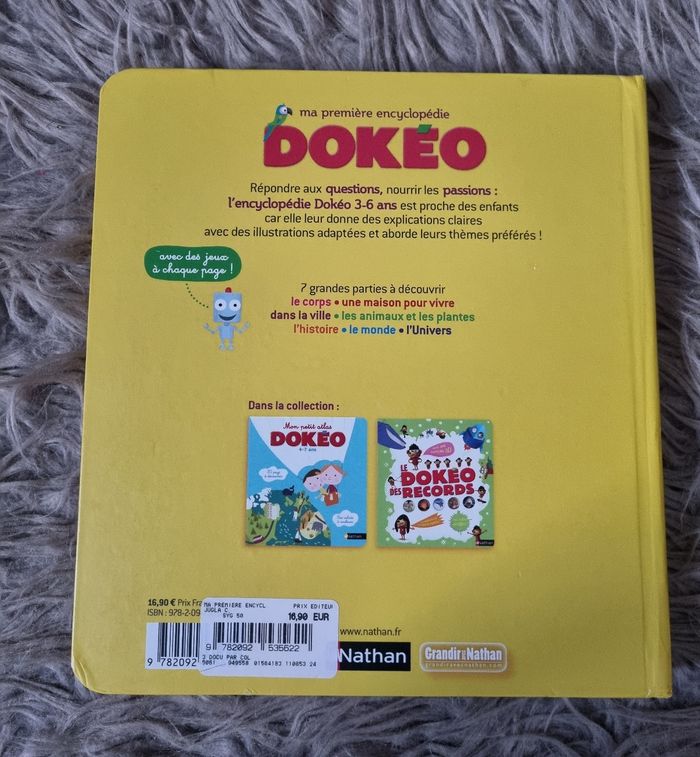 Livre "Ma première encyclopédie " Dokéo 3-6ans Nathan, dans le livre il y a "le corps", "une maison pour vivre", "dans la ville", "les animaux et les plantes", "l'histoire", "le monde" et "l'univers" , avec 7 grandes images à déplier (légèrement abîmé voir photos) sinon le reste du livre en très bonne état.