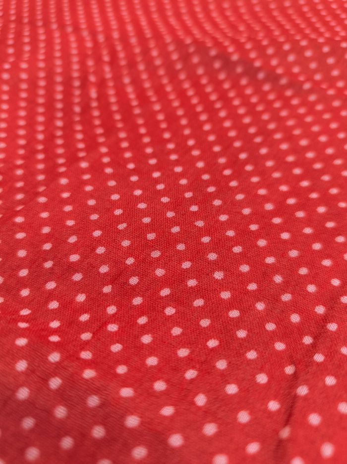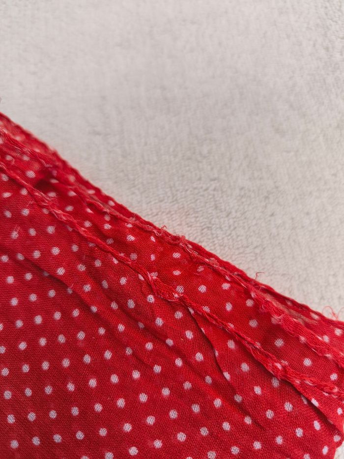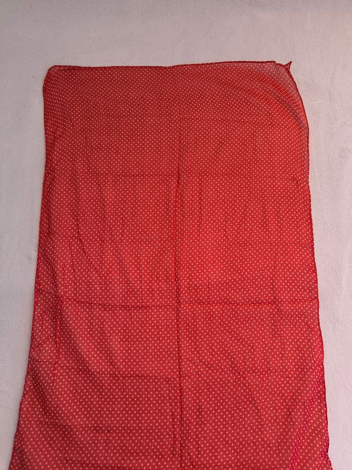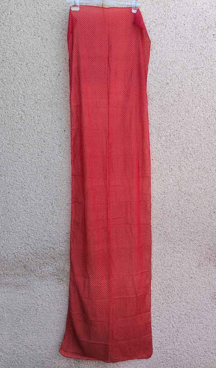 Foulard / Écharpe • Coloris rouge, blanc • Imprimés pois • Tissu fin • Quelques fils de tirés, côtés effilochés Longueur totale : 172 cm Largeur : 49 cm En bon état #evelyneaccessoires