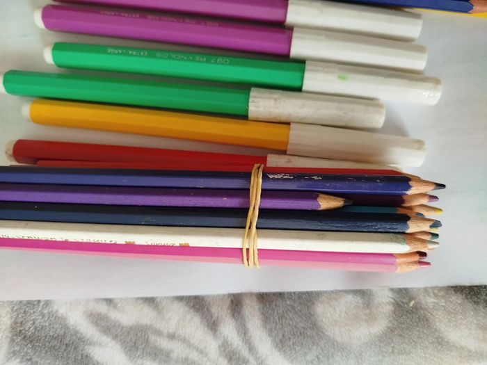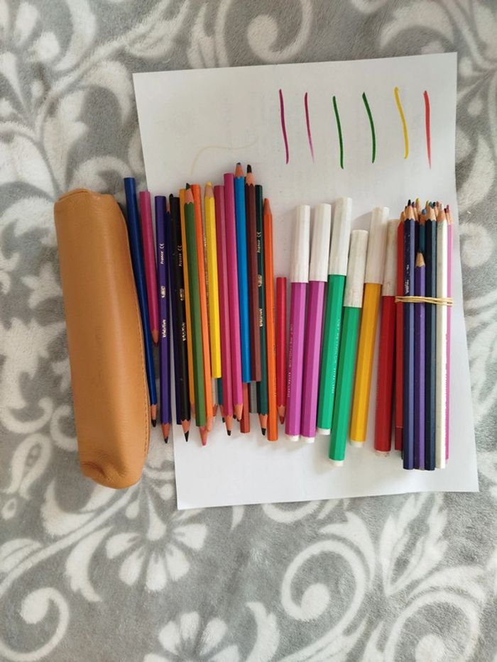 Lot comprenant une petite trousse, se ferme très bien en simili, quelques petites tâches voir photos Crayons de couleurs et feutres fonctionne très bien , pas très présentable mais peuvent encore servir.