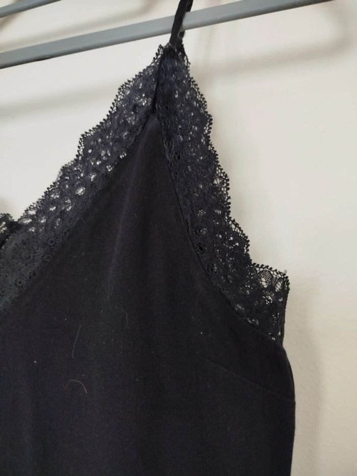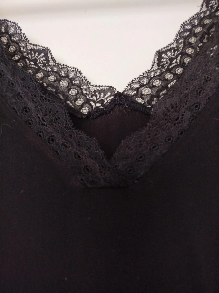 Petit débardeur noir sans manche encolure en v devant et dans le dos en dentelle De marque Etam taille 36 en très bon état Largeur entre aisselle 42 cm Étiquette coupée c'est un tissu assez souple et doux c'est pas du coton je ne sais pas ce que sait