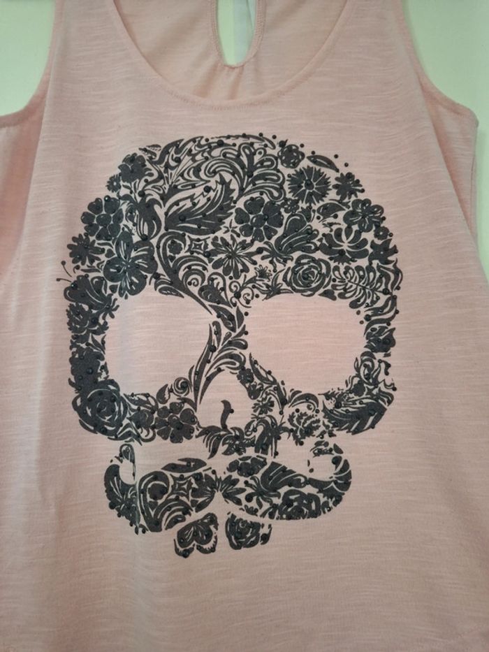 Attention taille à vérifier Elle n'est pas indiquée largeur sous aisselle 42 cm longueur 60 cm T-shirt sans manche je pense à un 38 , il mesure 27 cm entre les bretelles si vous souhaitez d'autres mensurations c'est possible sur demande merci légèrement transparent avec un motif de tête de mort de marque vintage dressing un lacet dans le dos à nouer