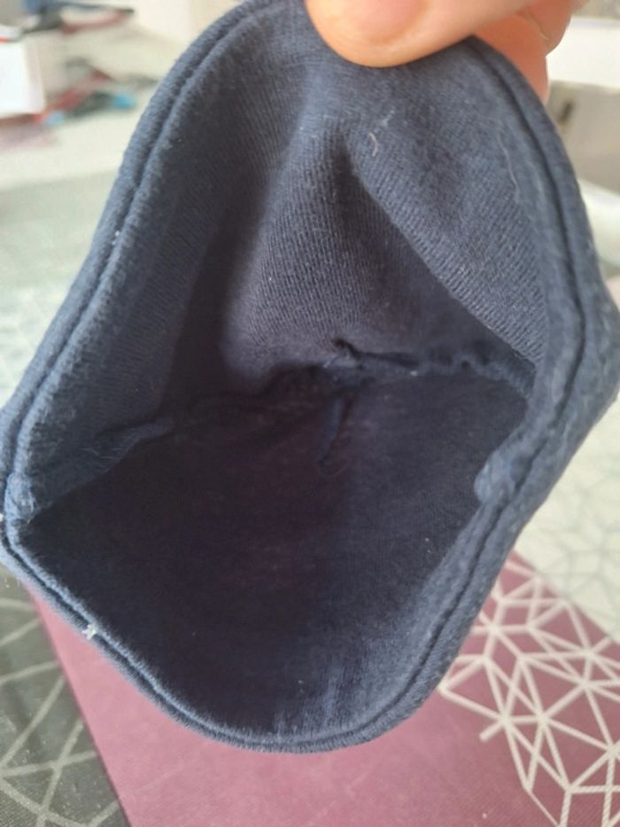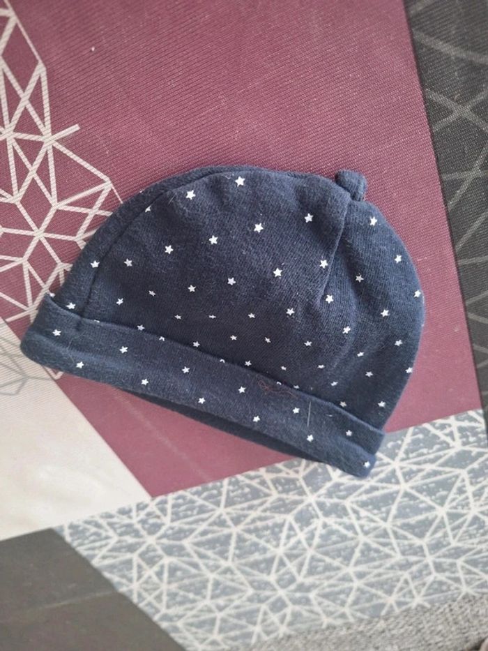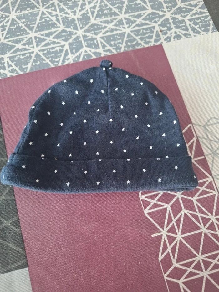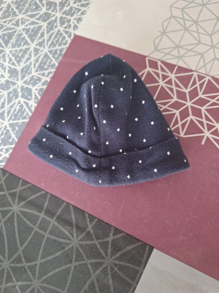 Petit bonnet bébé en très bon état bleu marine avec des petites étoiles blanches je n'ai pas d'étiquette mais il mesure 14 cm à plat tour de tête 30 cm