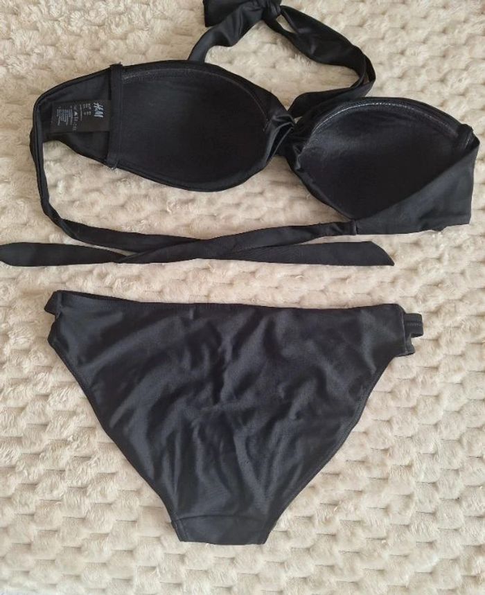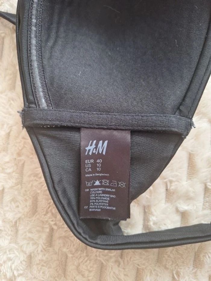Maillot de bain 2 pièces noir très bon état pour le haut de marque H&M avec étiquette taille 40, composition Polyamide elastane et polyester Le bas noir également taille 38 Polyamide elastane un peu porté voir photos de minuscules bouloches, sans marque