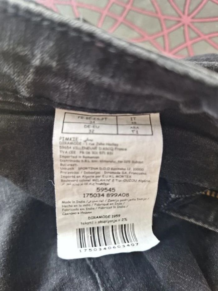 Pantalon en Jean noir, taille 34, Pimkie, en bon état, fausse poche sur le devant 2 poches derrière Largeur cheville 12 cm 75 % coton 22 % polyester 3 % elastane